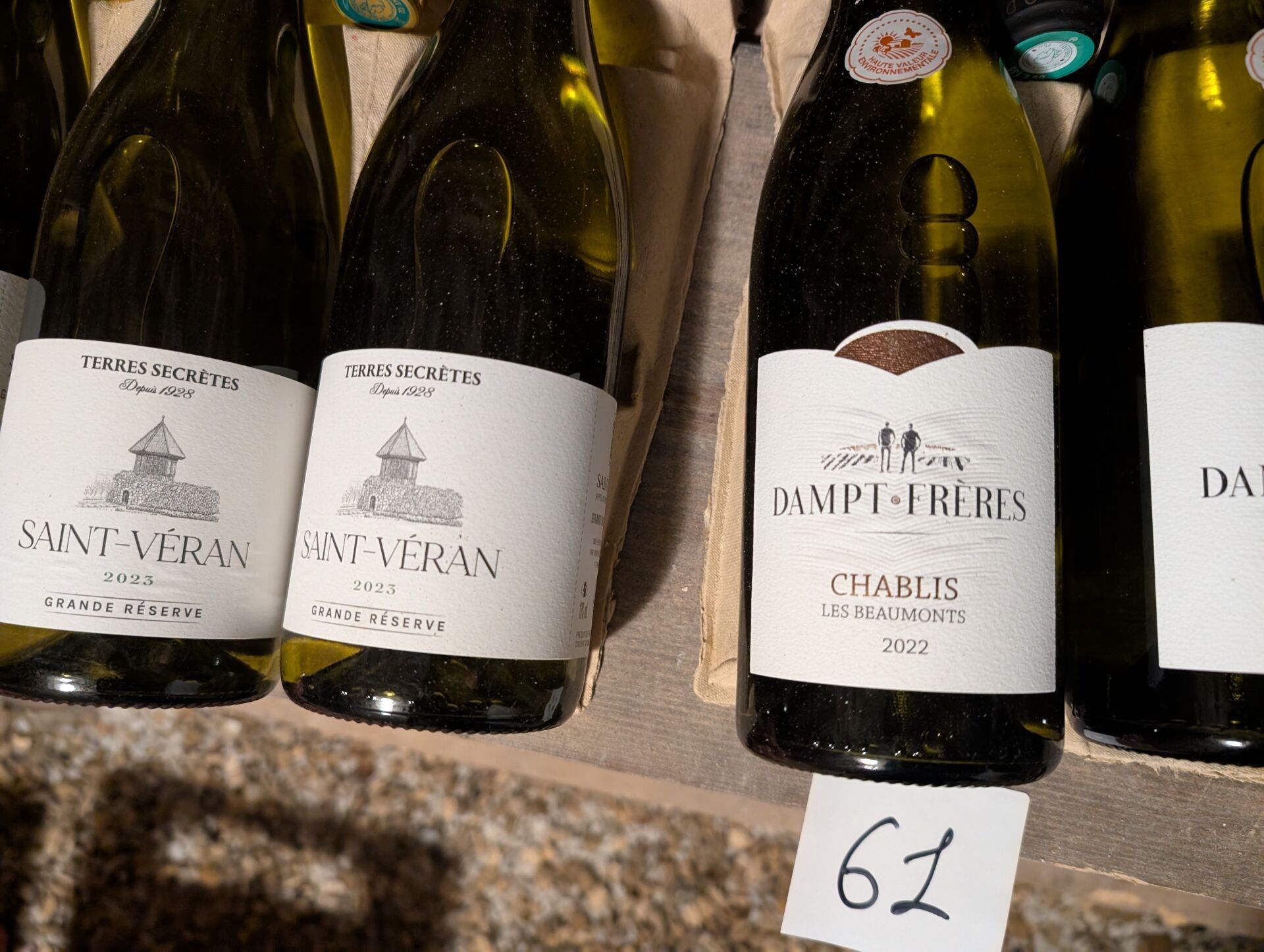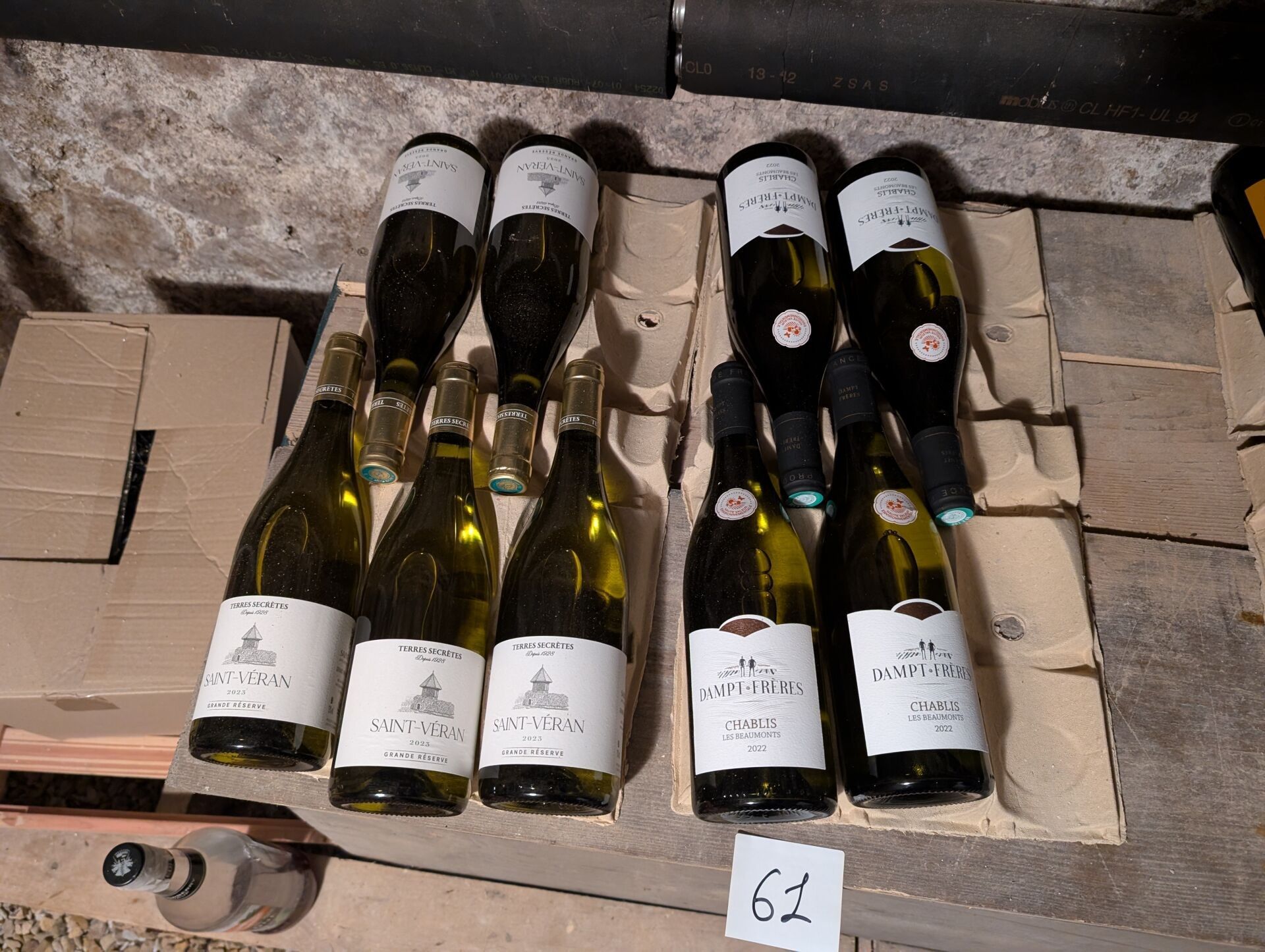 9 bottles : - 4 Bottles CHABLIS LES BEAUMONTS 2022 DAMPT FRERES - 5 Bottles SAINT VERAN TERRES SECRETES 2023 SEMUR-EN-AUXOIS (12 Place Notre Dame) Pick-ups : On 19 November between 3pm and 6pm and on 21 November between 9.30am and 12pm exclusively.