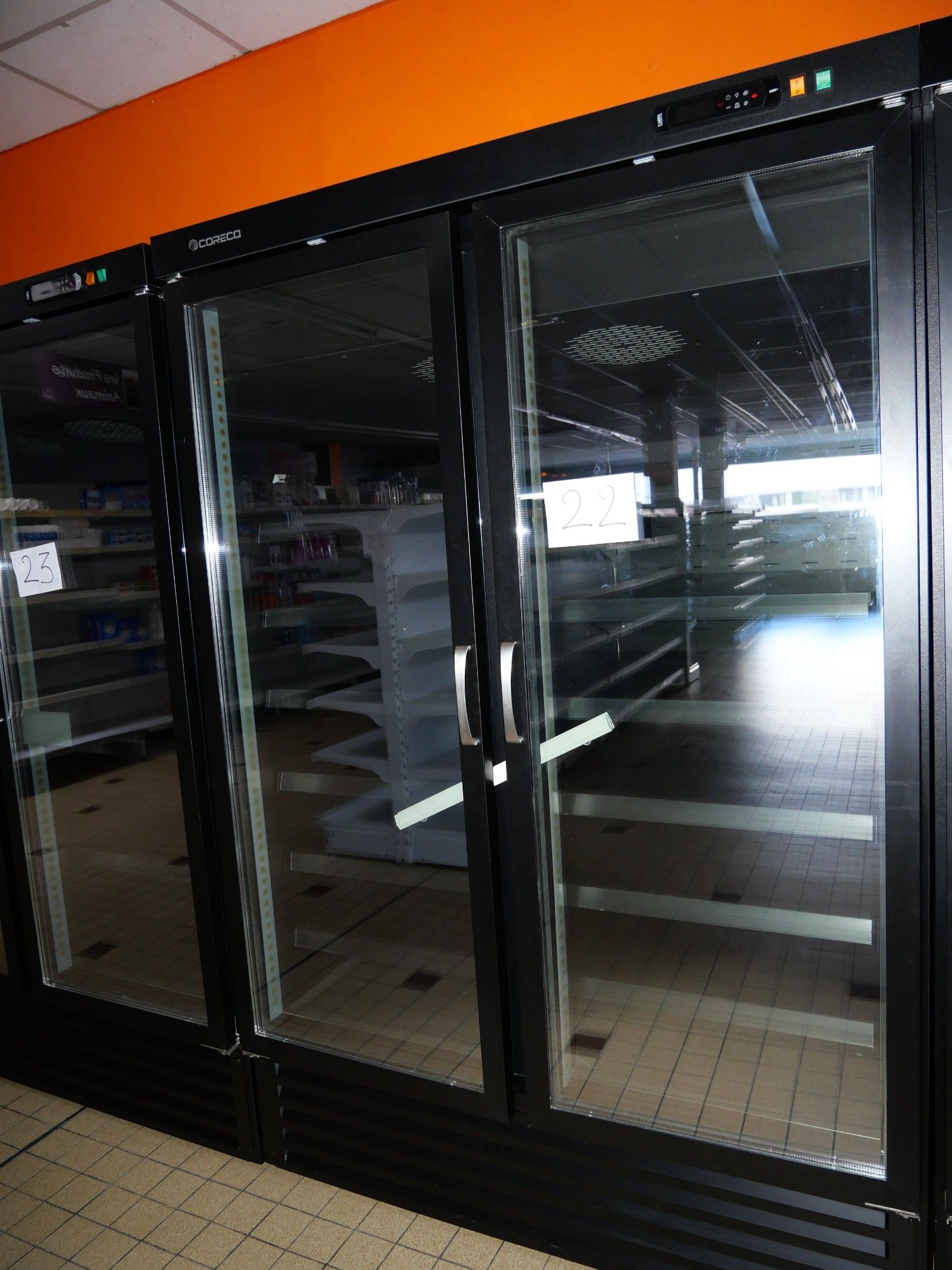 A Coreco 2-door negative refrigerated display case, as is, with the buyer responsible for providing the equipment for removal and dismantling in compliance with safety standards,