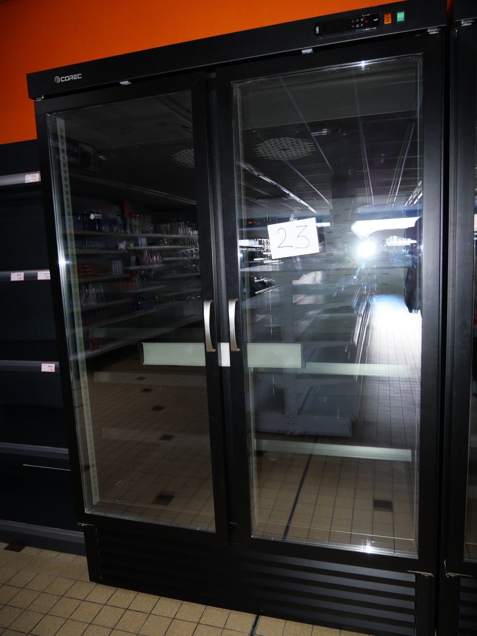 A Coreco 2-door negative refrigerated display case, as is, with the buyer responsible for providing the equipment for removal and dismantling in compliance with safety standards,