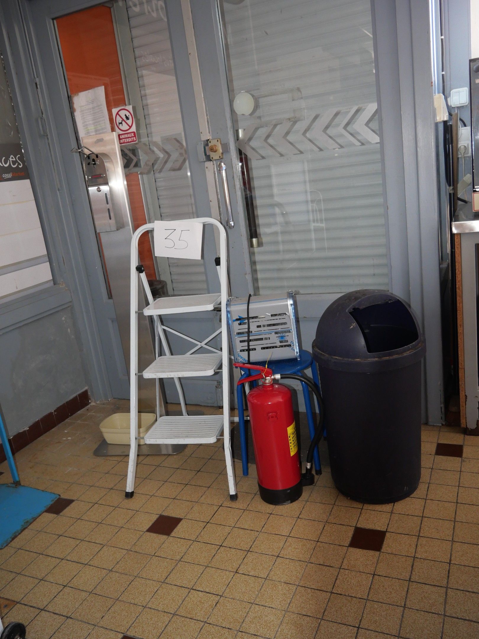 Lot consisting of an insecticide lamp, a Noviemeta gel dispenser, a used fire extinguisher, a safety mirror to be dismantled and a blue plastic waste bin, all as is.