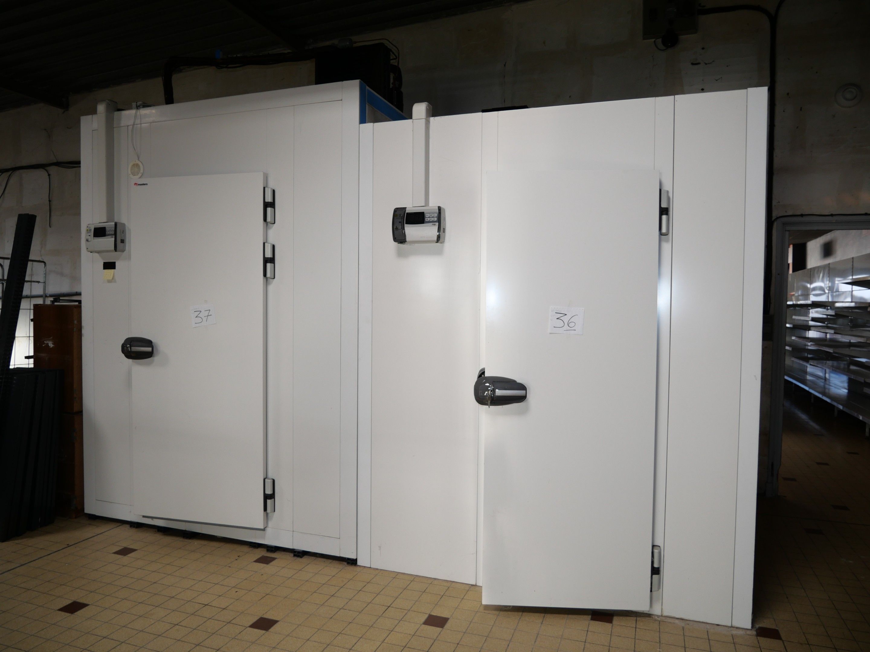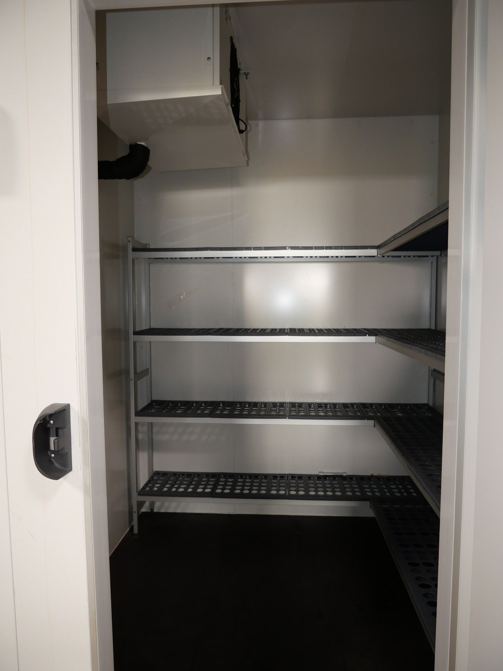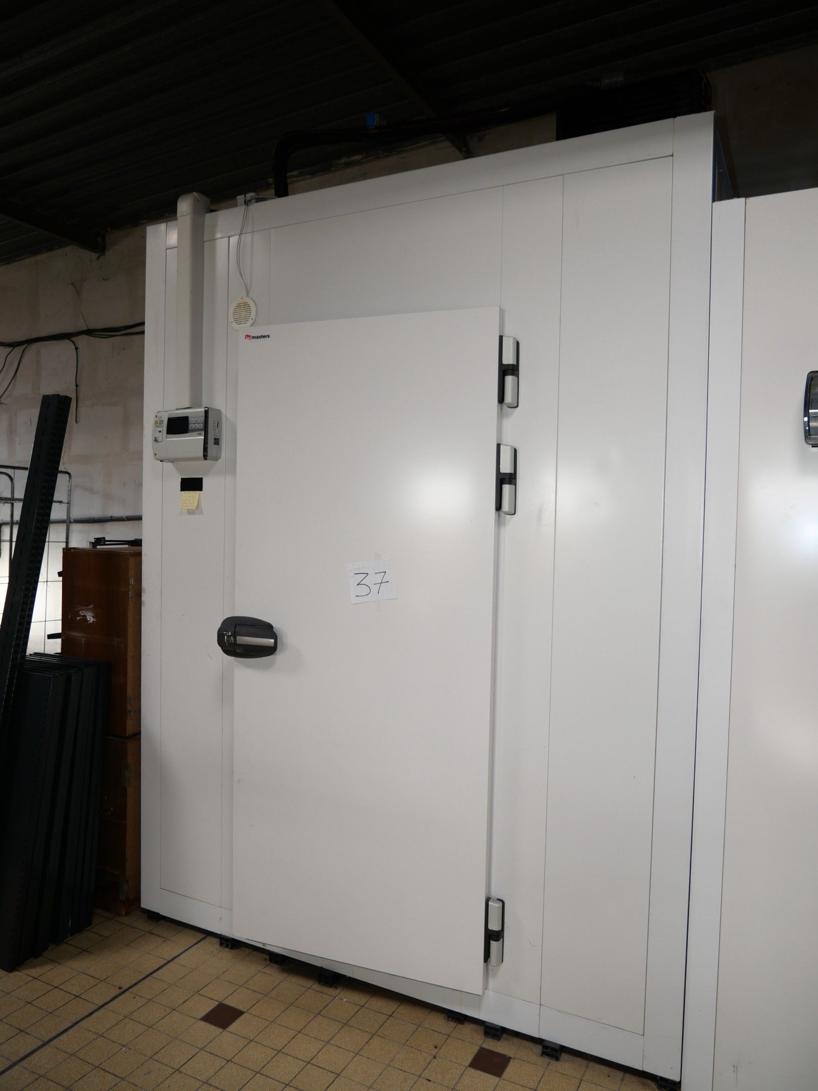 A Pego positive cold room, approx. 2 m x 2.5 m with 2 bays of metal and resin shelves, to be dismantled in compliance with safety standards. The buyer is responsible for providing the necessary equipment for removal.