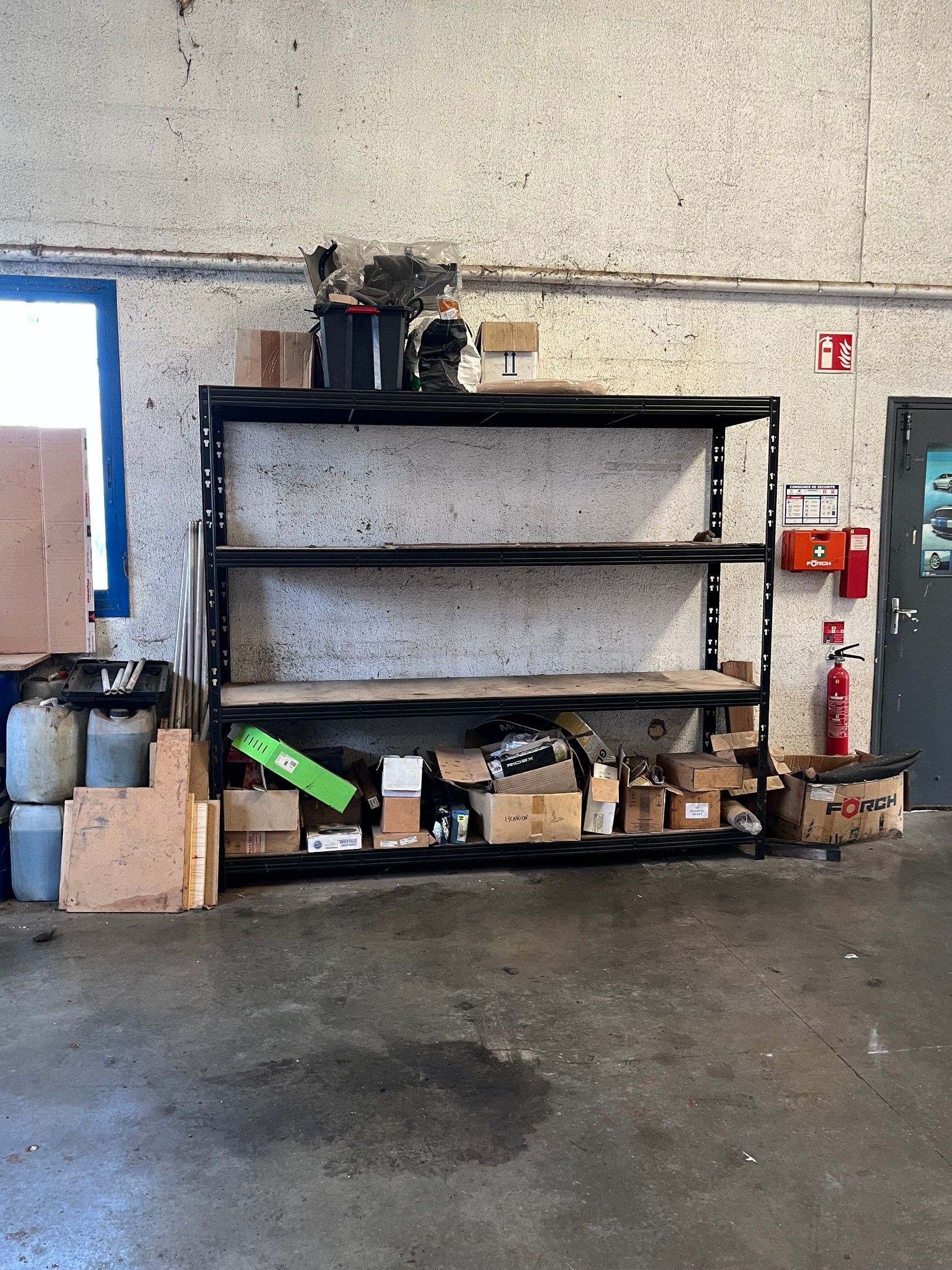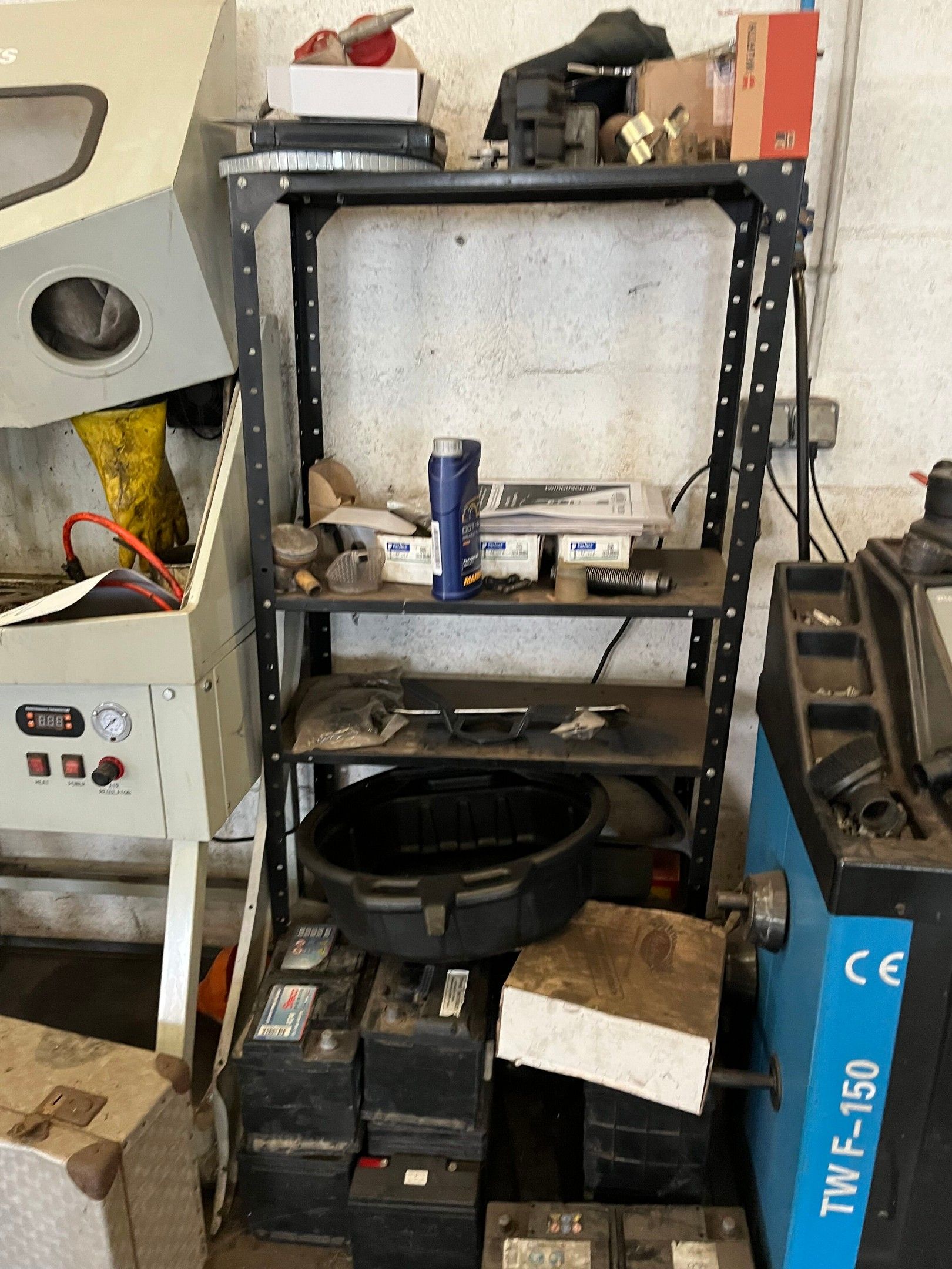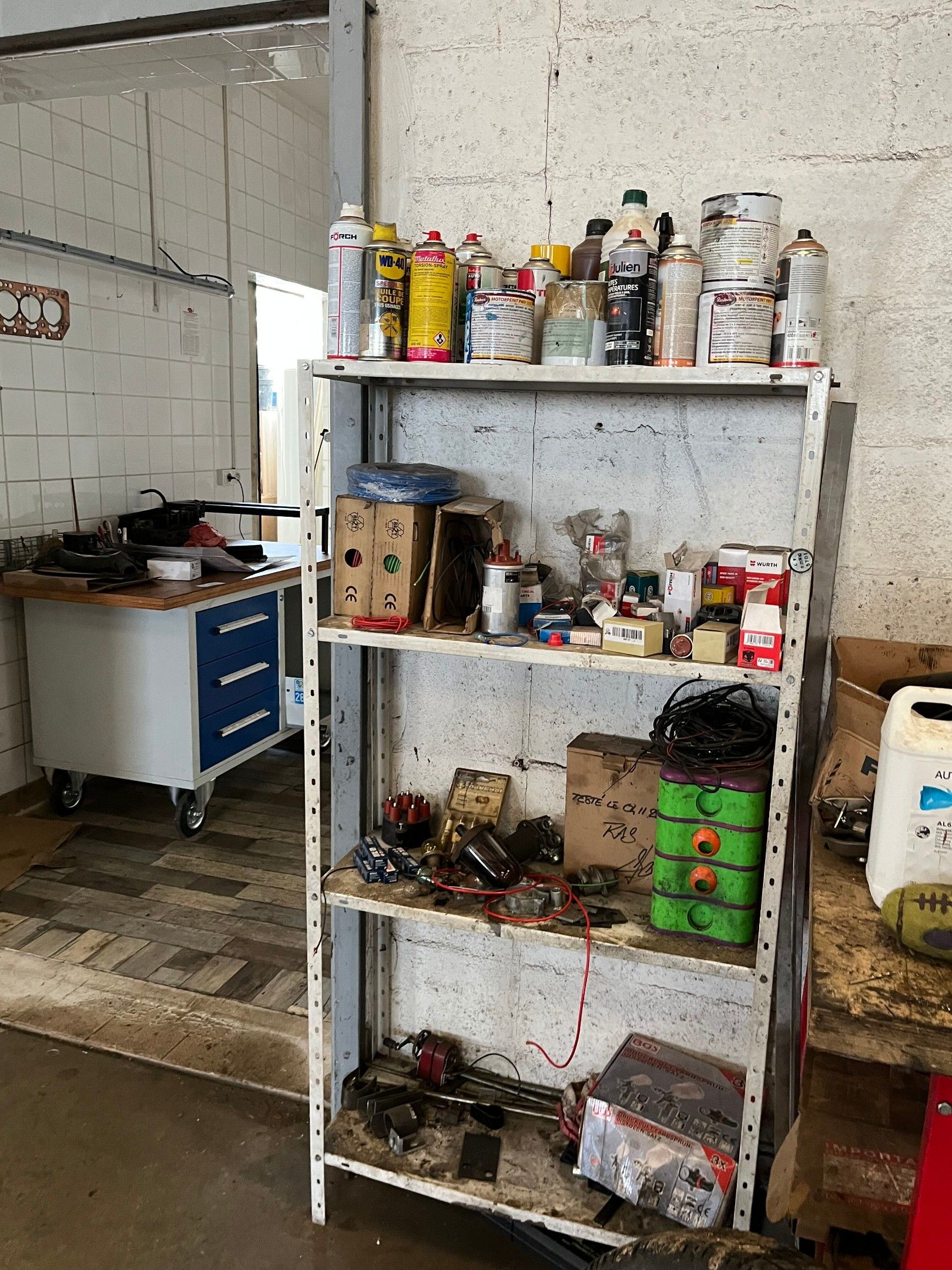 - Set of 8 shelves of different models, lot of parts, used batteries, 4 drums, cans, a piece of workbench furniture with red legs, all in unclaimed condition, to be cleared in its entirety,