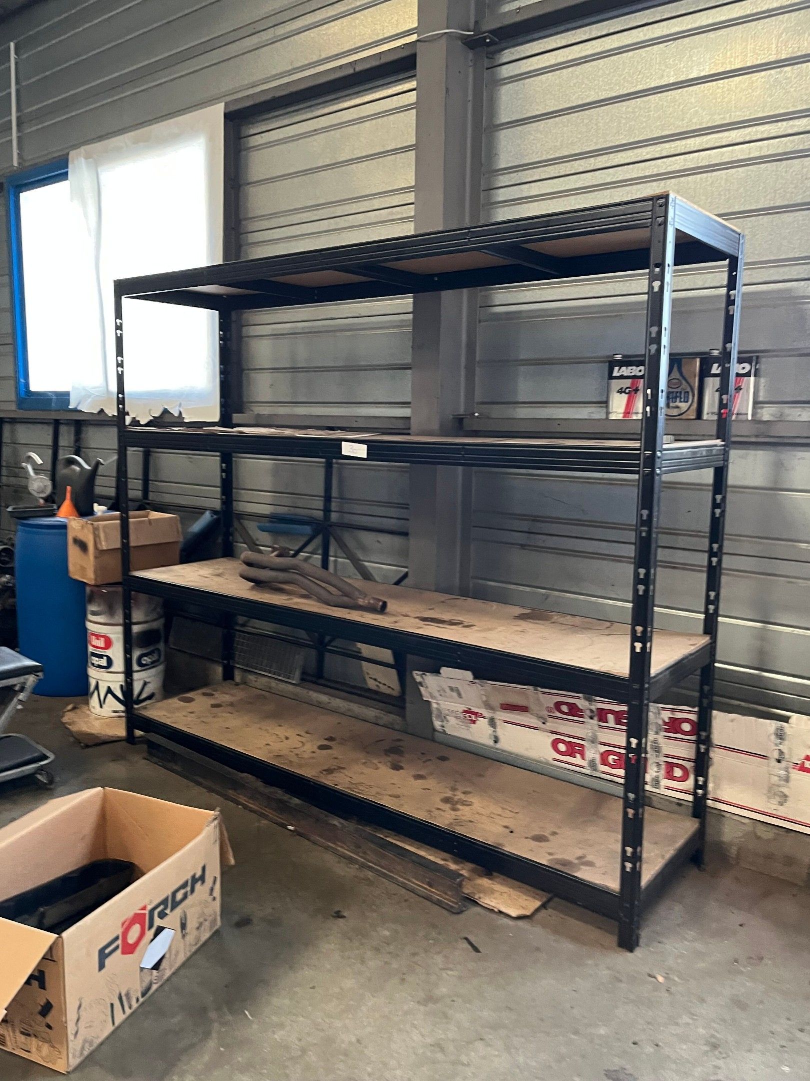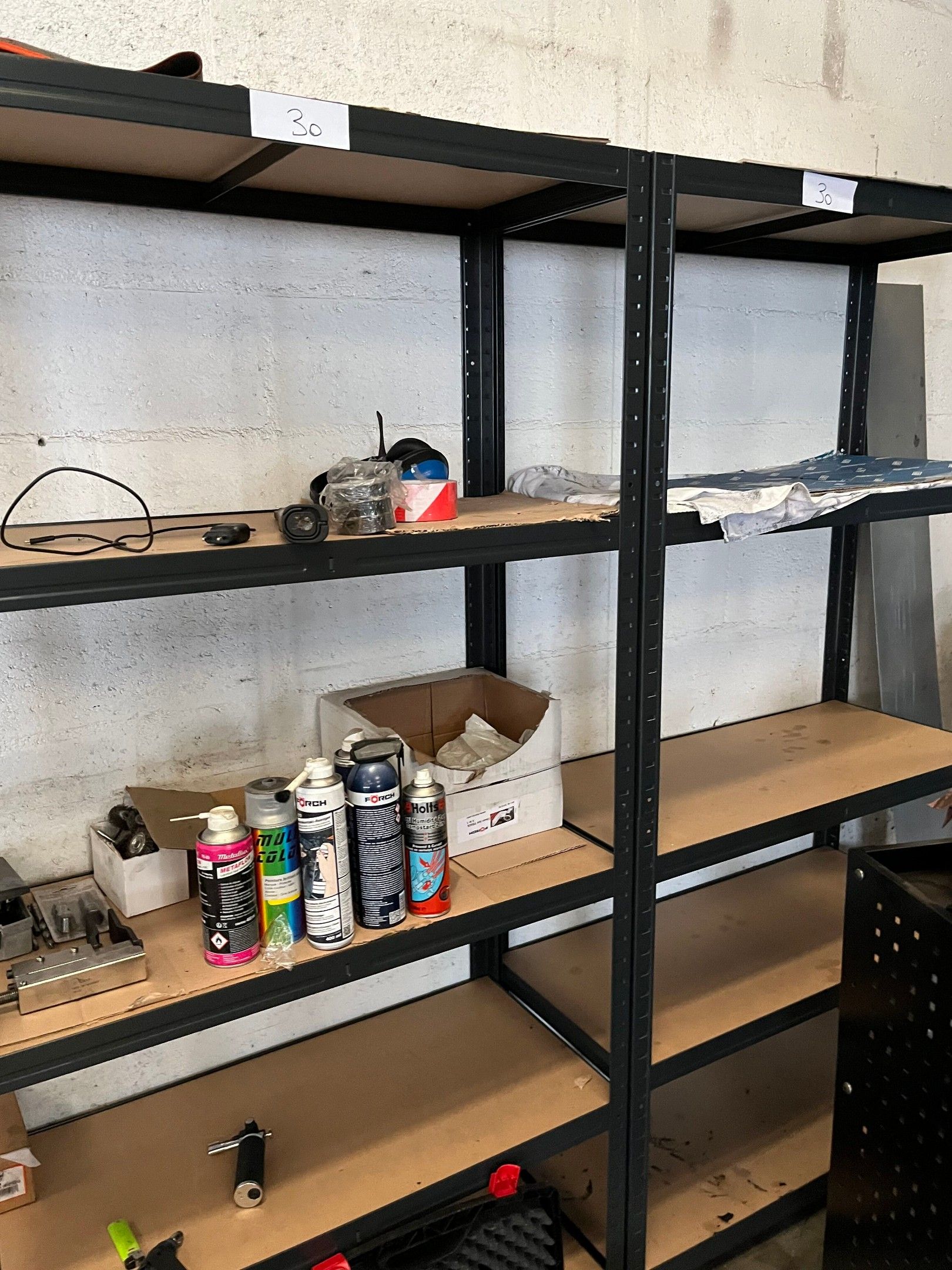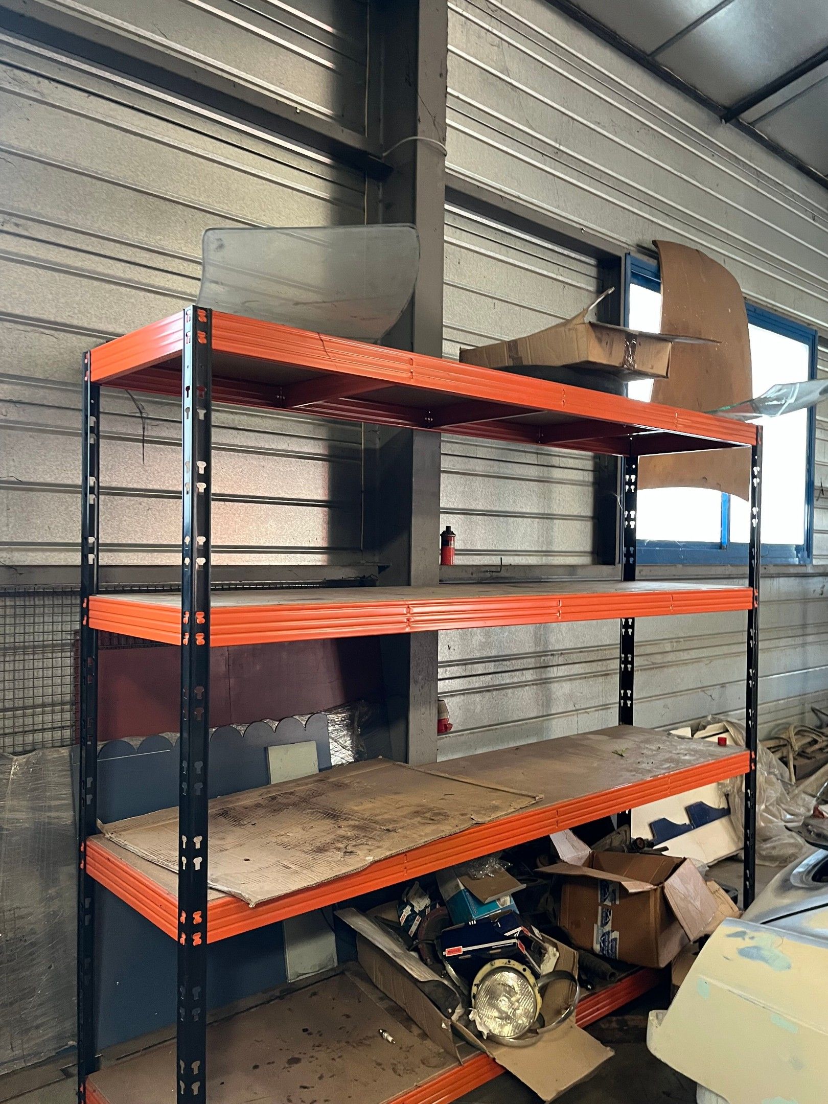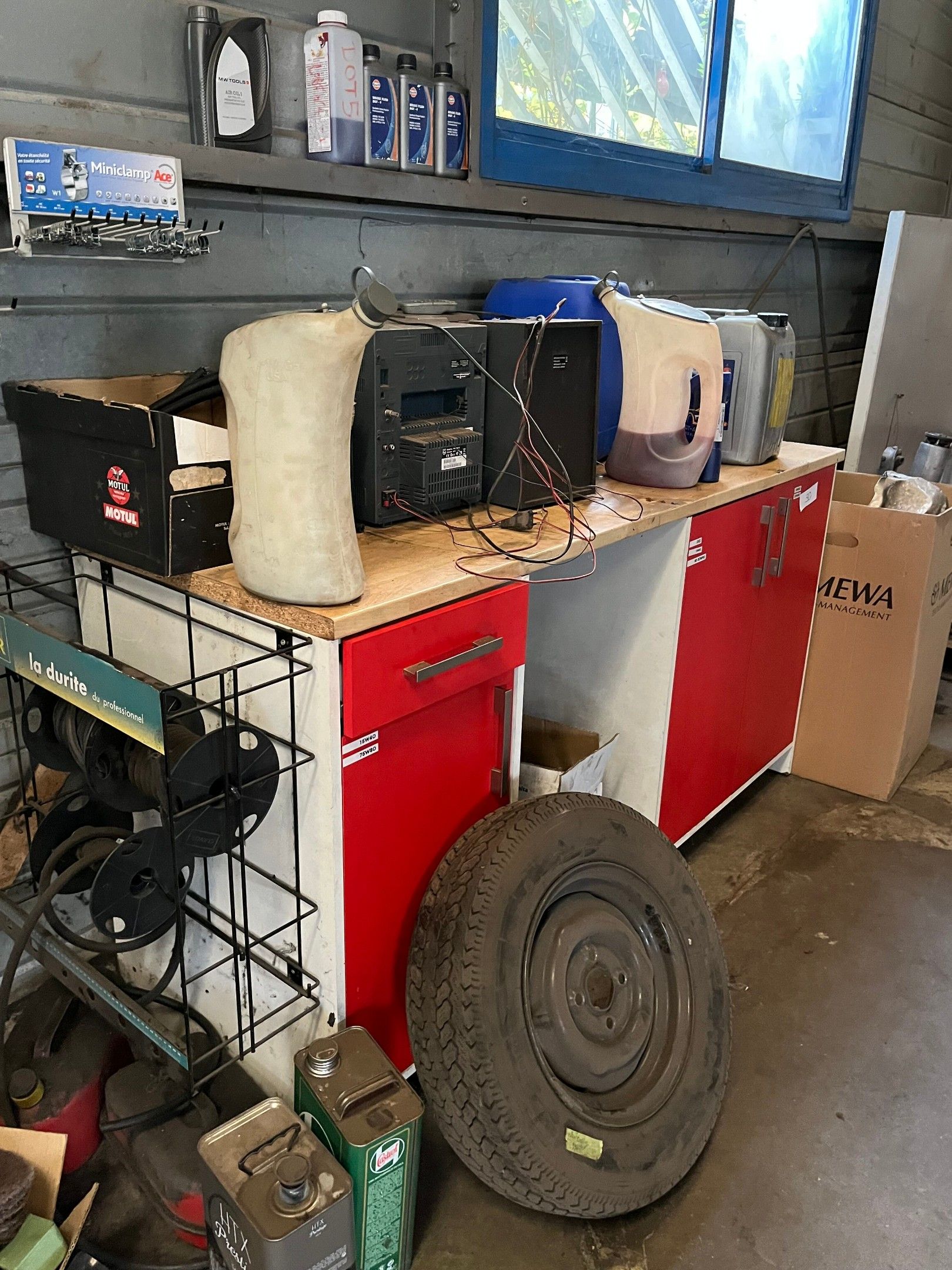 - Set of 8 shelves of different models, lot of parts, used batteries, 4 drums, cans, a piece of workbench furniture with red legs, all in unclaimed condition, to be cleared in its entirety,