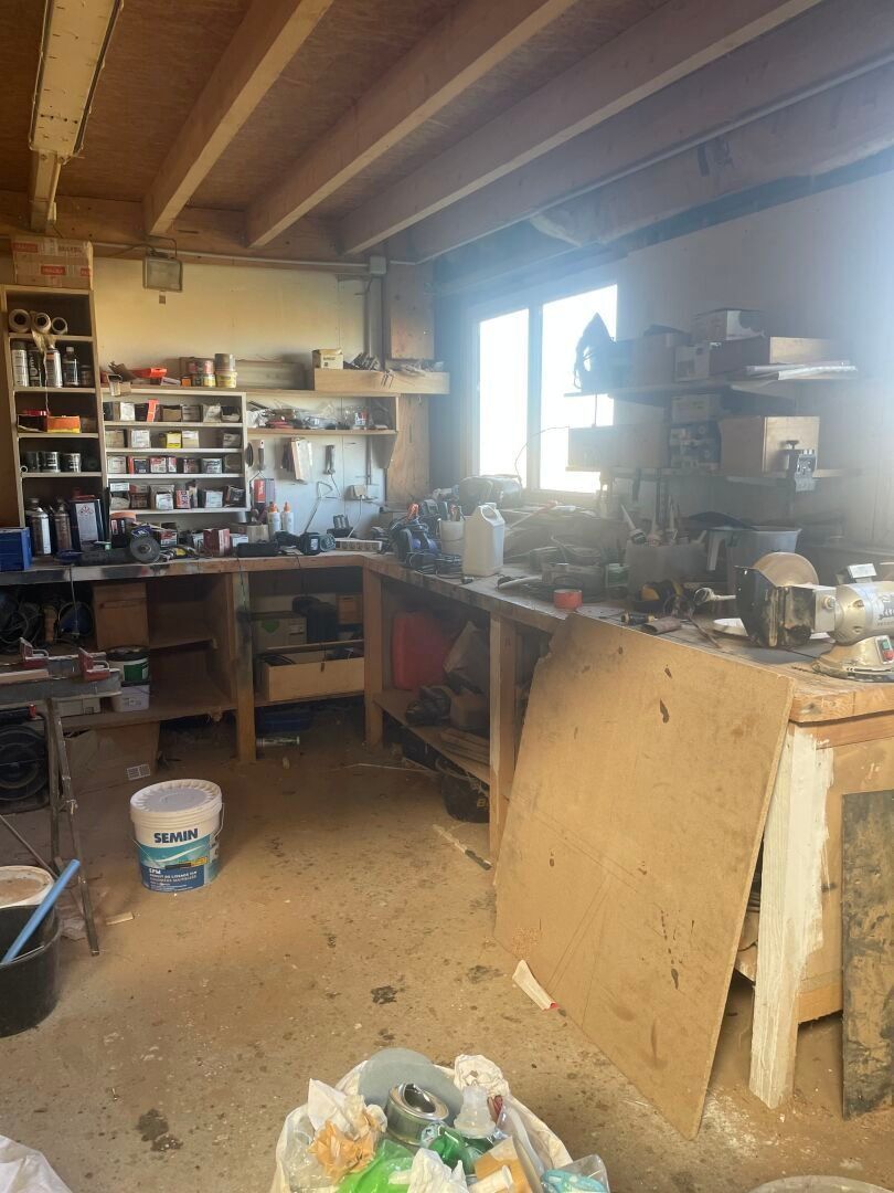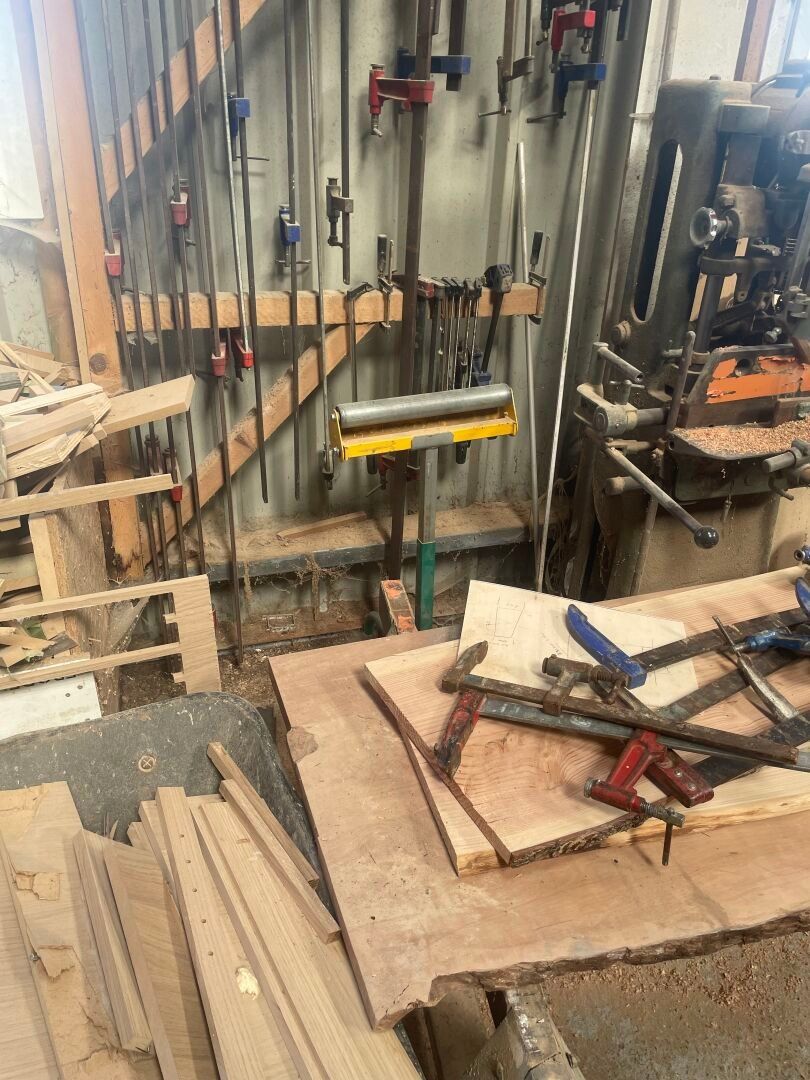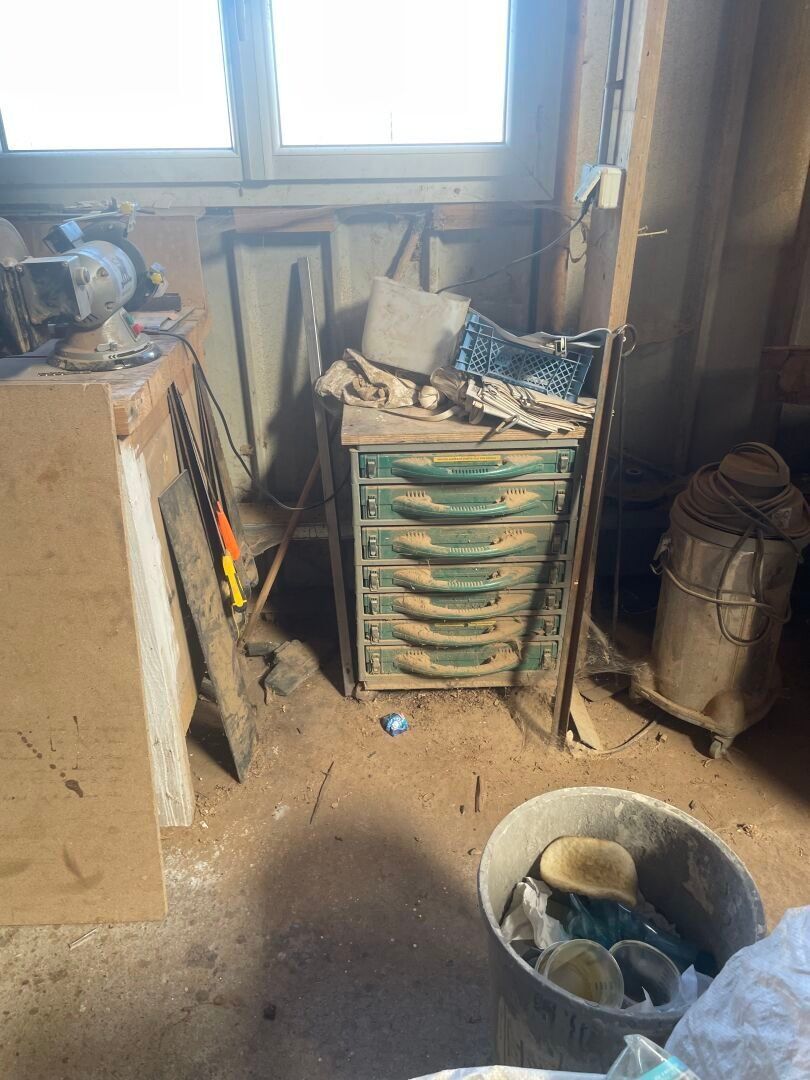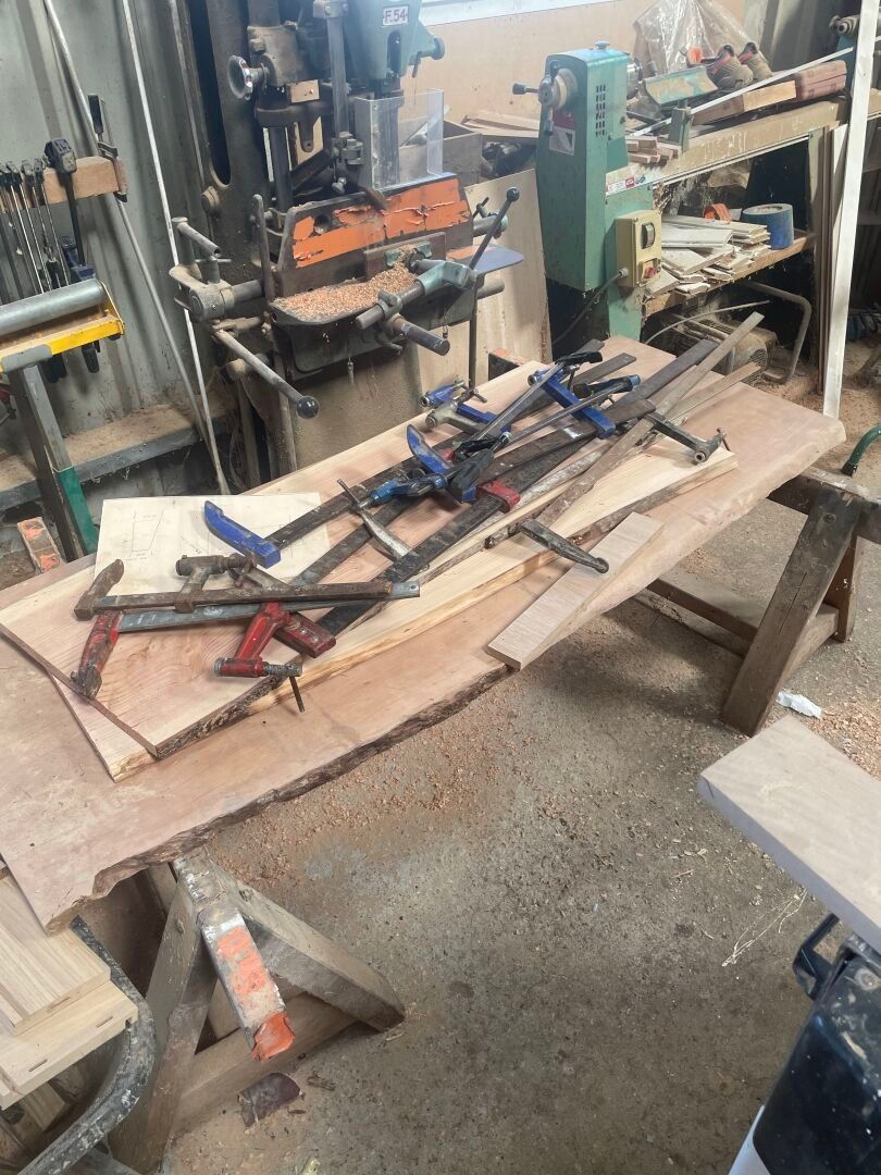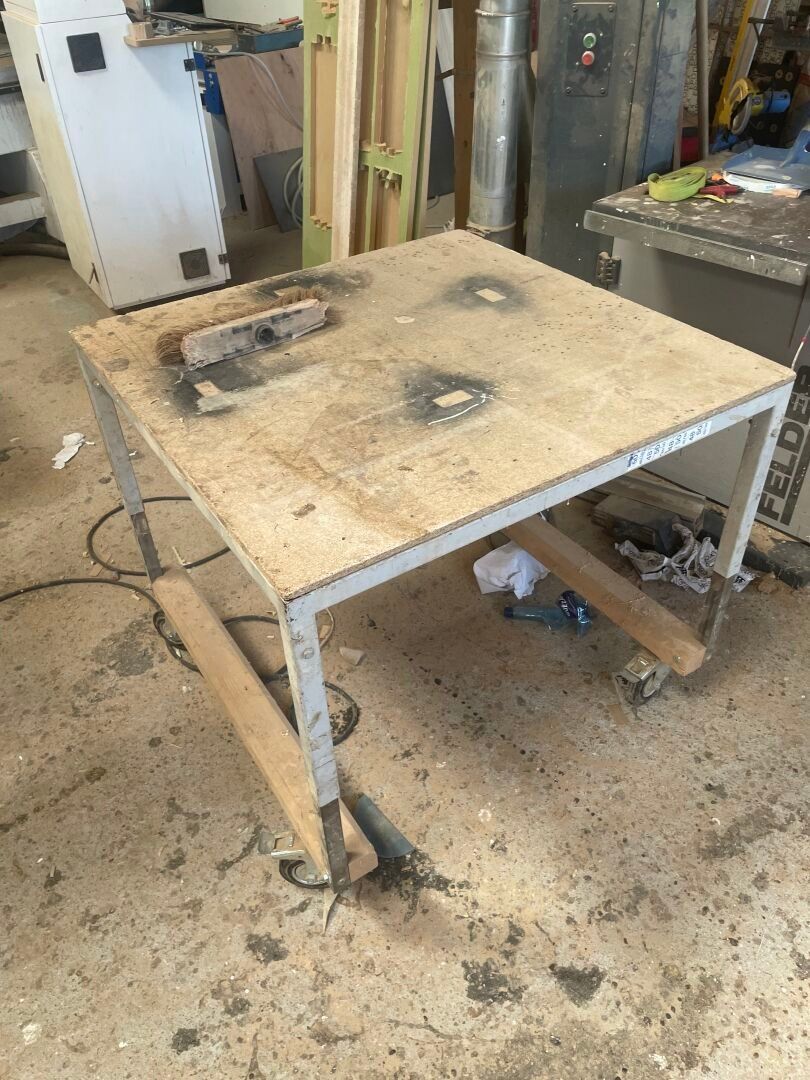 - Lot including Wheelbarrow with wood scraps, Pair of wooden trestles, Macc roller tripod trolley, Lot of approximately 25 clamps, Very used trolley on castors, Workbench with small tools and consumables, Very used trolley with drawers on castors, all in mint condition with no complaints,