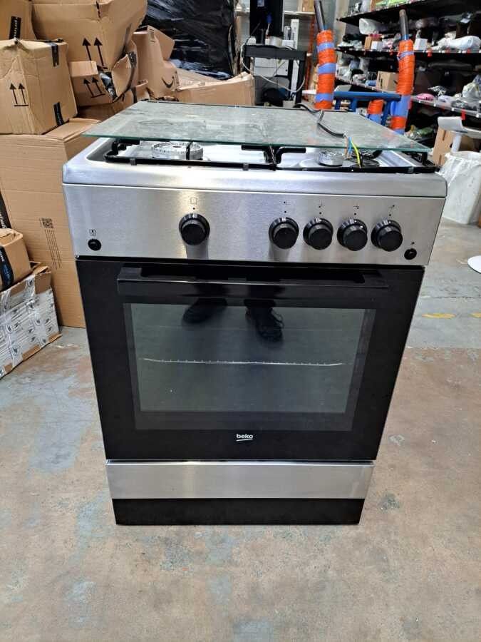 8798-650 / Free standing cooker - BEKO - FSG62010FX - 4 burners - Glass lid - Oven : 66 L - 2500 W - Storage box - Product : 60 x 60 x 85 cm - 44.5 kg - ( Serial N° 77389876302410001901 ) /// SECOND HAND PRODUCT LACKS SUPPORTS