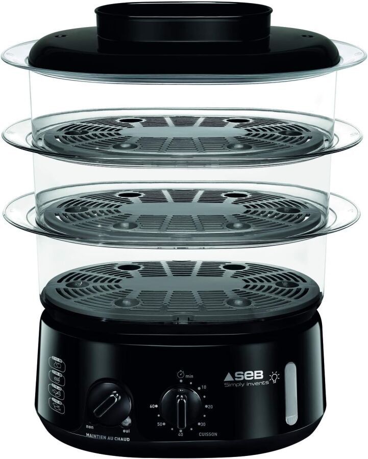 9245-95 / Seb Simply Invents - Steam Cooker - Steam cooker with 3 modular bowls - Capacity: 9 L - Output: 900W Keep warm - unattended cooking, automatic shut-off - Black - VC110800 /// SLIGHT TRACES OF USE - NON ORIGINAL PACKAGING - ABIME: SETTING BUTTON DOES NOT HOLD
