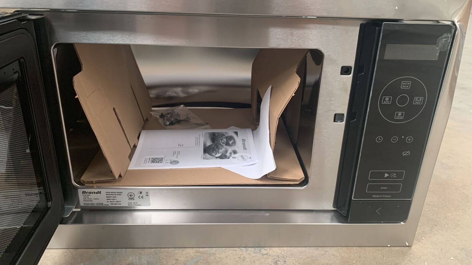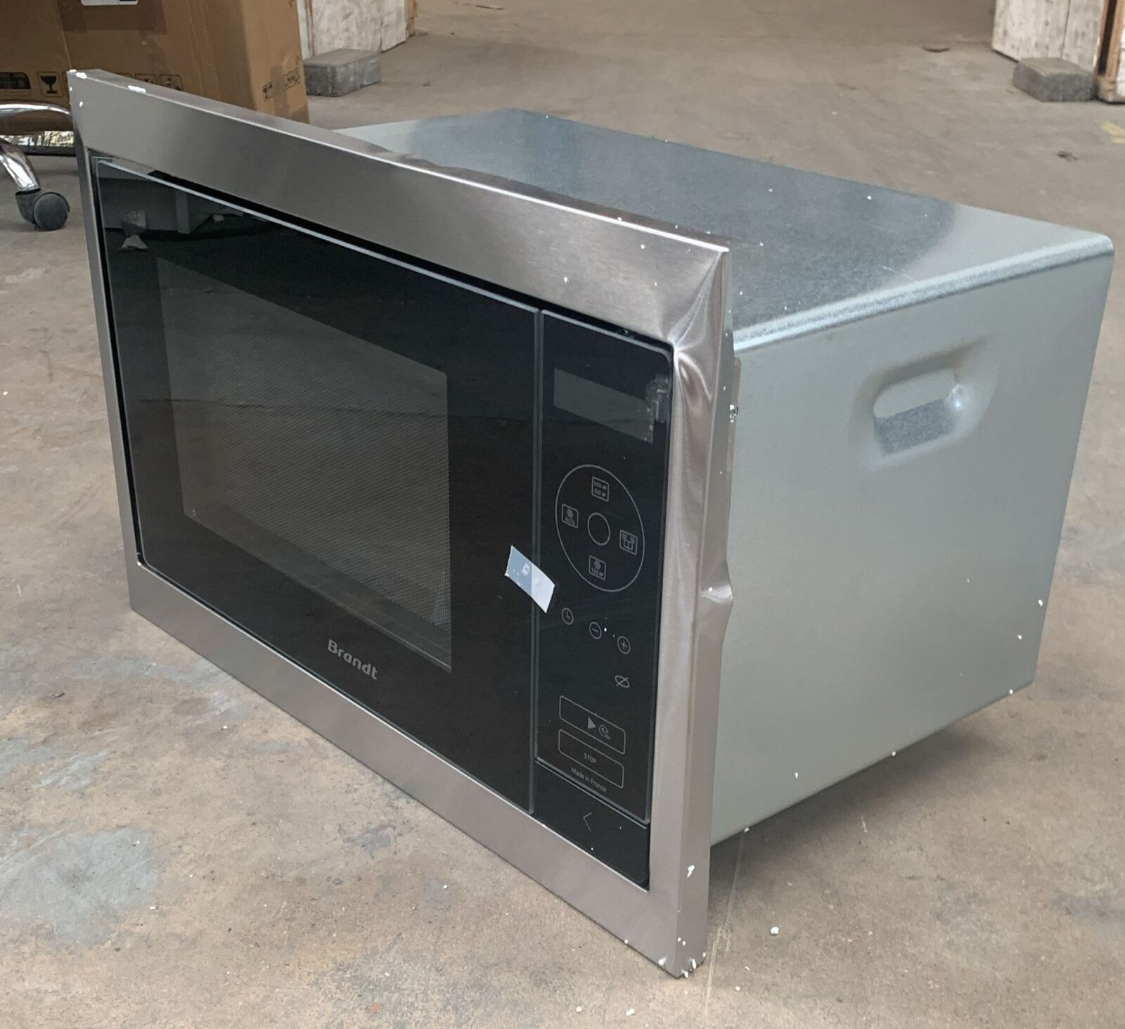 9640-330 / Built-in microwave - BRANDT - bms7120x - capacity - 26L - power : 900W - electronic control - fast defrost - stainless steel - timer - /// LIKE NEW WITH DEFAULT: multiple dents on the side