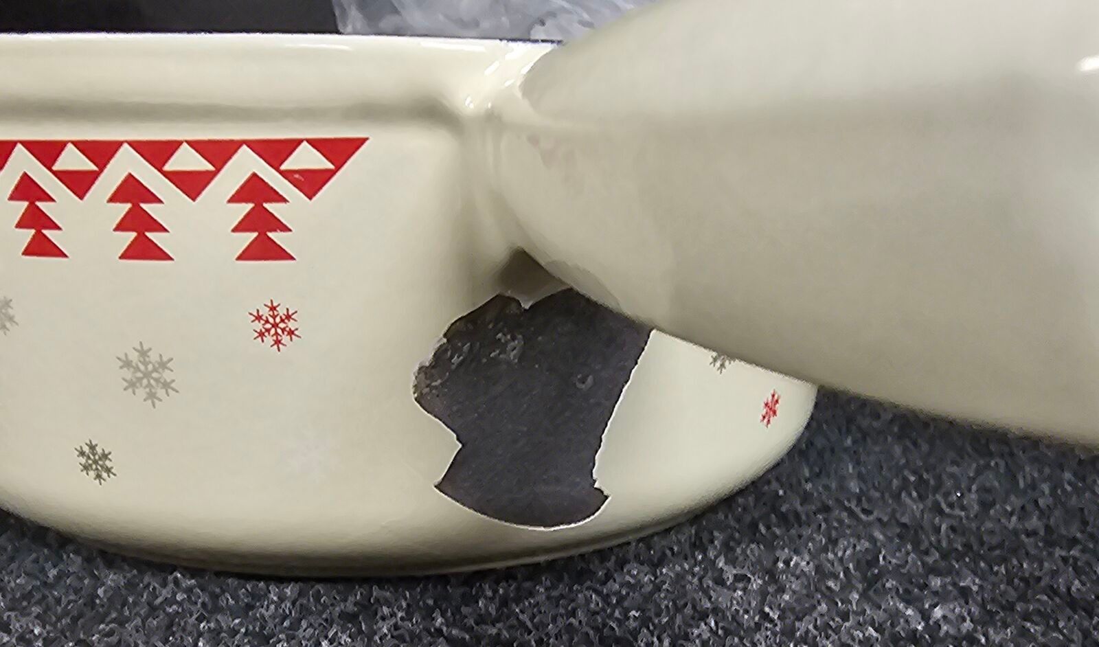 9245-255 / Tableandcook - Savoyard Fondue Set - Enamelled cast iron - Compatibility: All burners including induction - Diameter 22cm - Supplied with 6 3-prong fondue forks, a metal warmer and a burner - Colour: Beige decorated with a mountain frieze. - 403816 - Product dimensions (L x W x H) 34 x 24 x 22.5 cm; /// LIKE NEW - DEFAULT/DAMAGE: CHIPPED PAINT AND NO PAINT UNDER THE HANDLE.