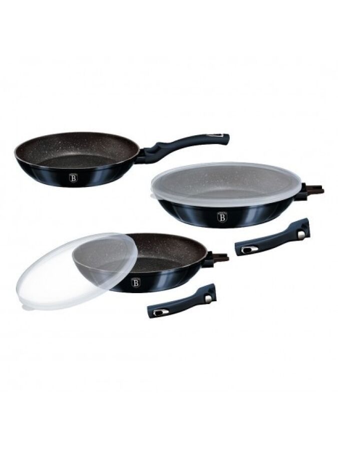 8289-466 / Frying pan set - BERLINGER HAUS Collection Aquamarine BH-7056 - 5 pcs - Removable handle - Thick-walled forged aluminium body material - 3-layer non-stick marble coating - Pan: 20X4,5 cm 1L / 24X4,8 cm 1,7L / 28X5,2 cm 2,4L -2 lids - Suitable for all types of hob, including induction - PFOA, LEAD, cadmium free /// AS NEW