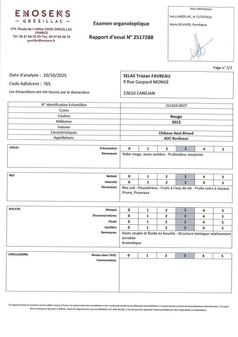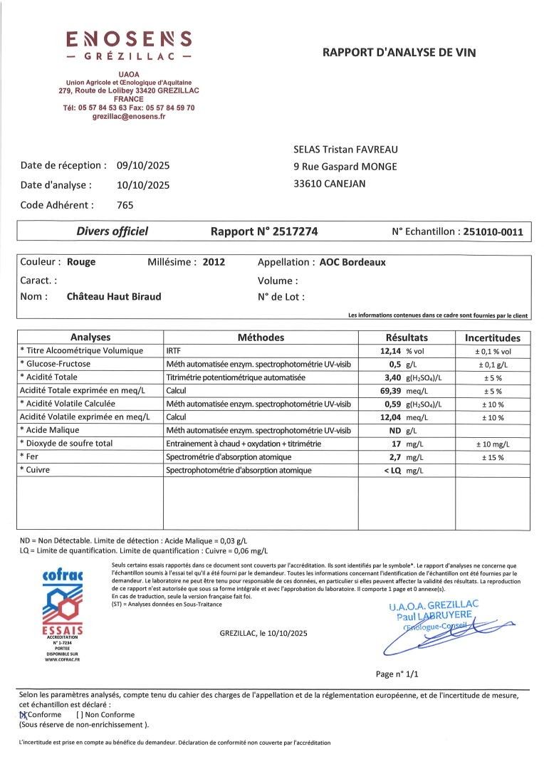 SOLD ON DESIGNATION. 1 Stock of about 1958 bottles 37,5cl Château Haut Biraud, Bordeaux, Red, 2012