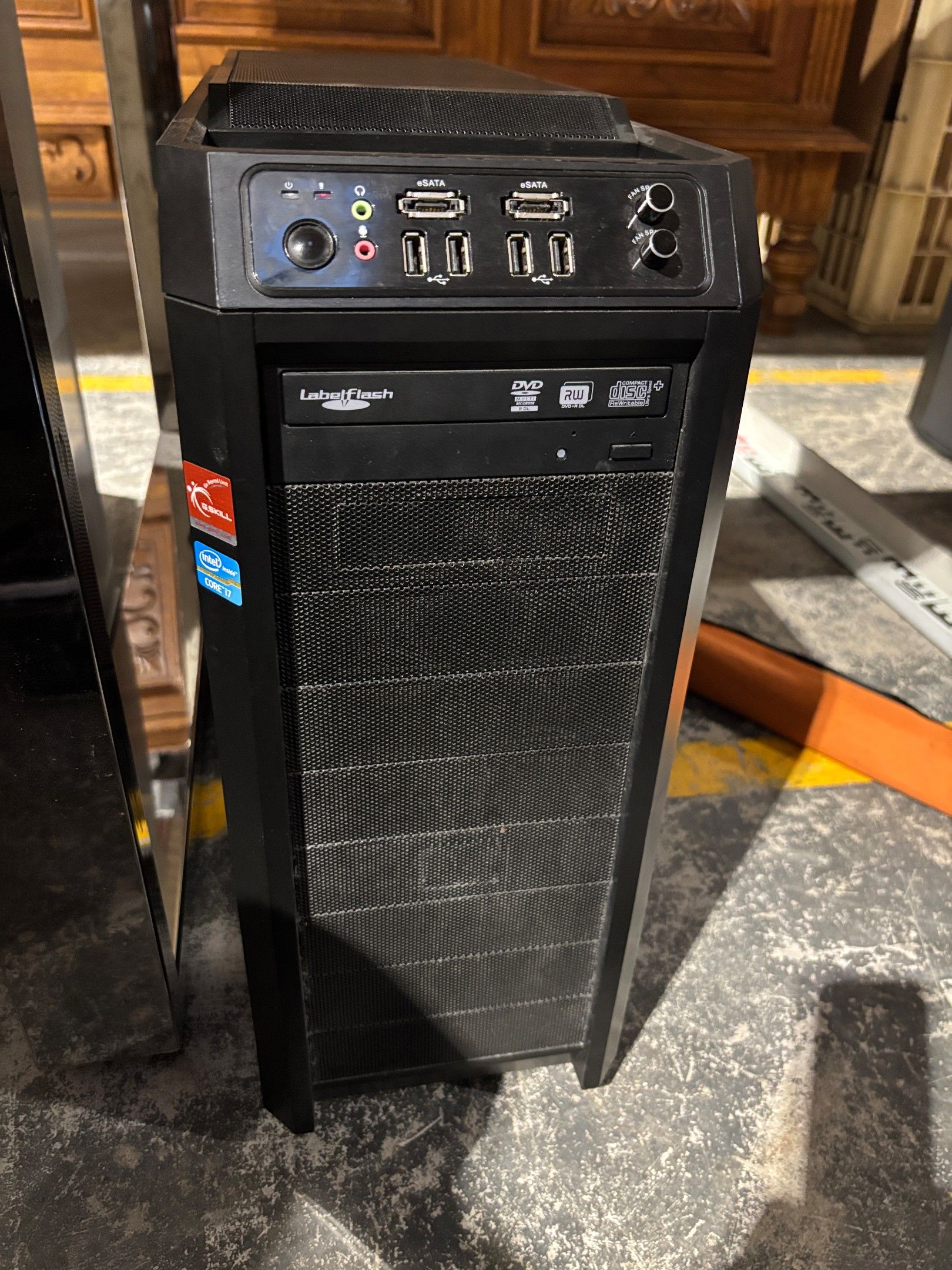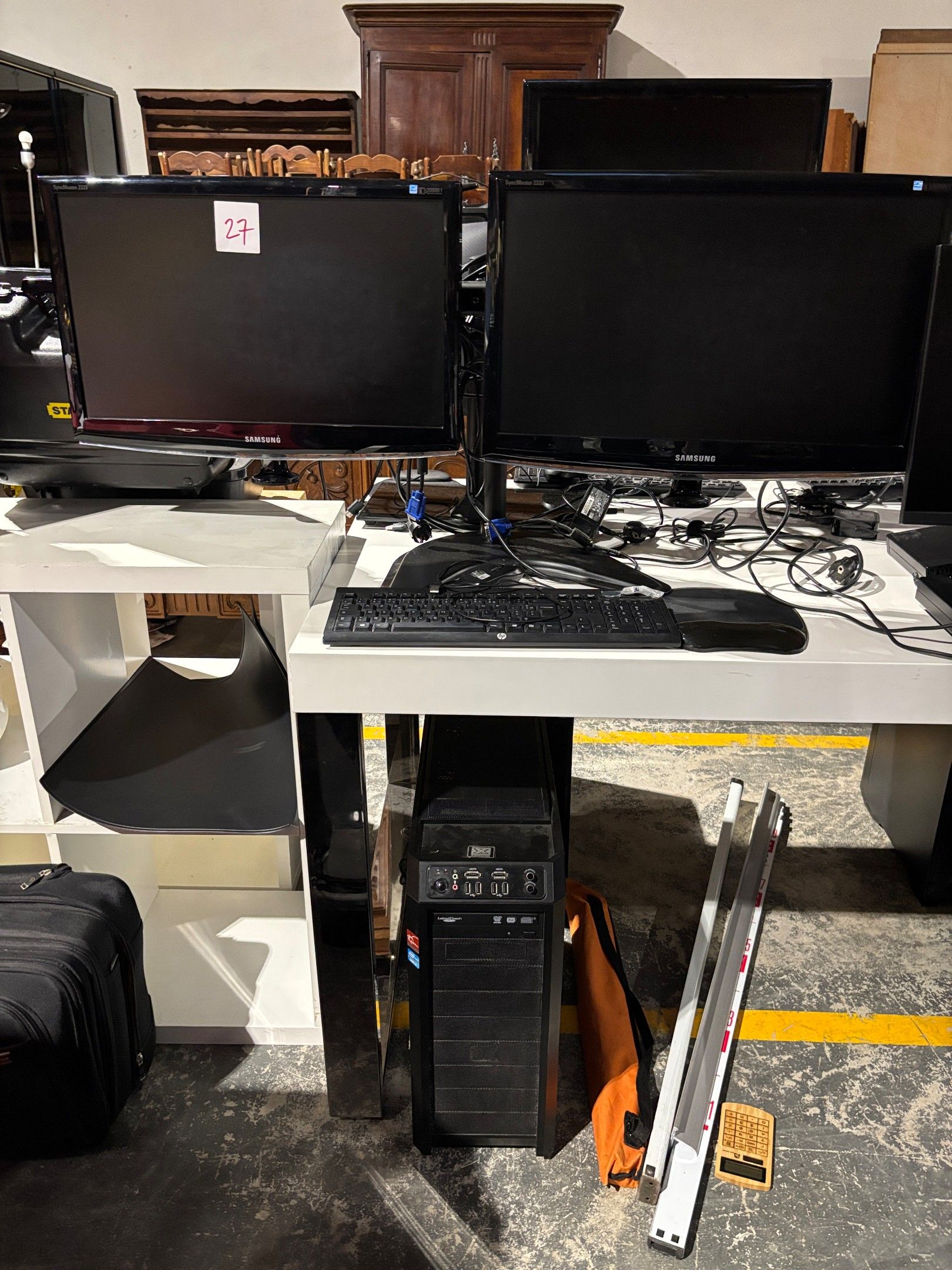 Desktop computer including two SAMSUNG flat screens, GSKILL INTEL CORE i7 CPU, keyboard, wired mouse