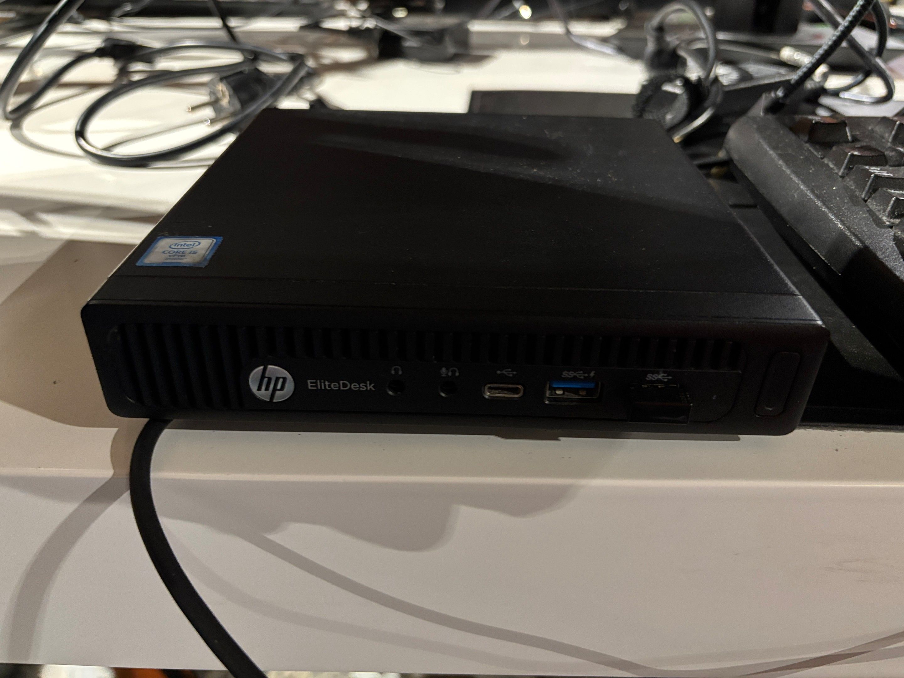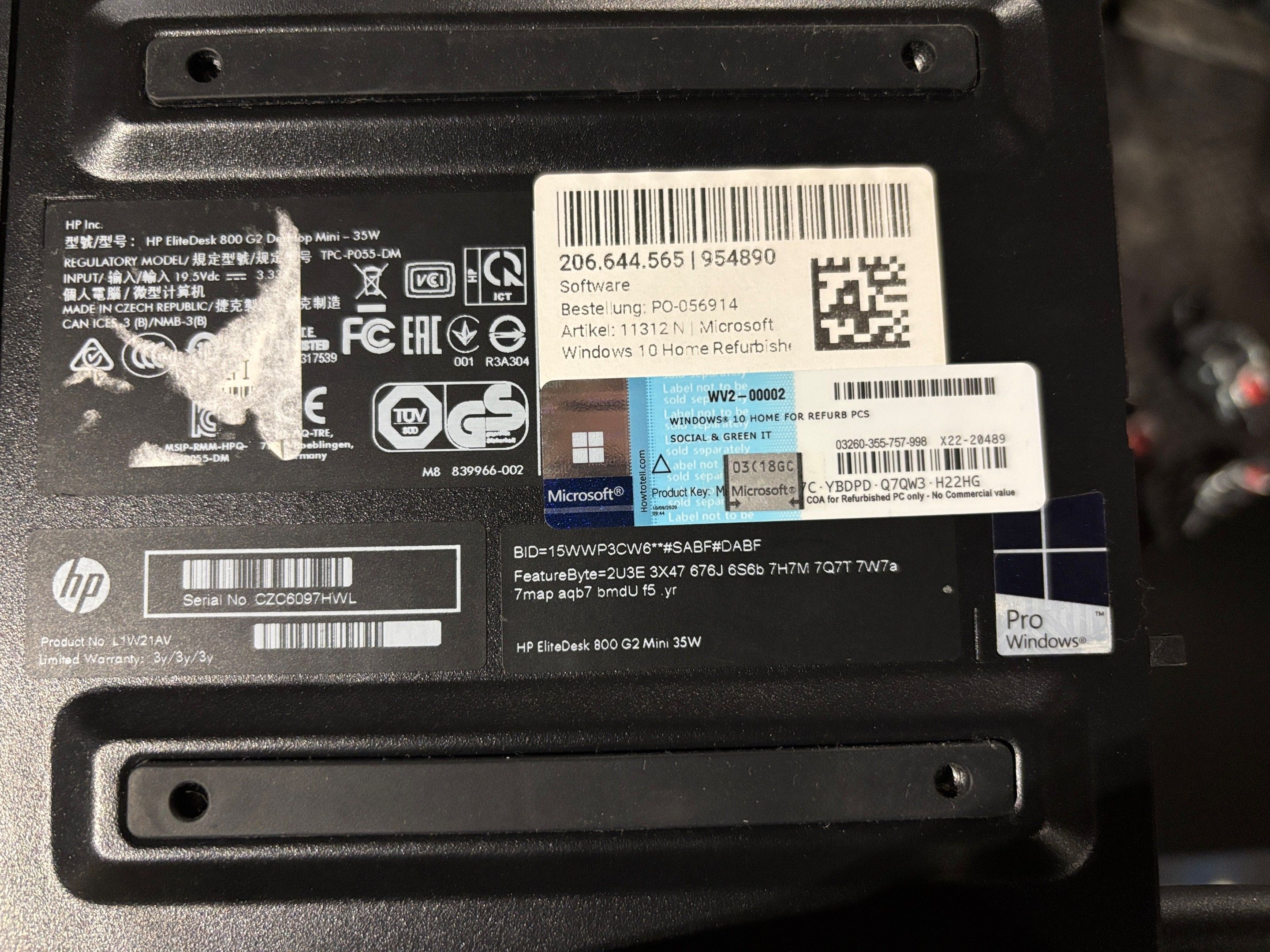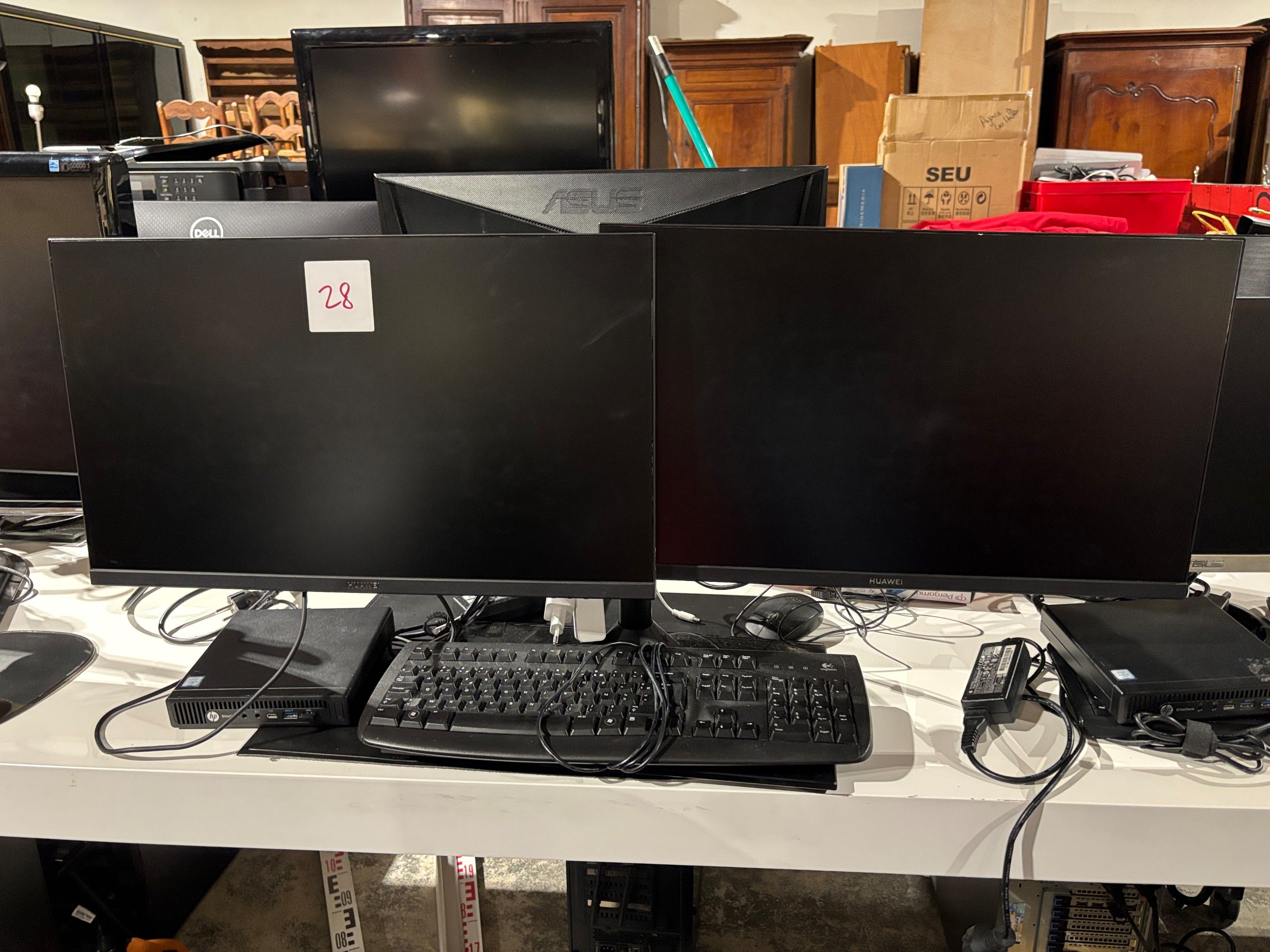 Desktop computer including two HUAWEI flat screens, HP ELITEDESK 800 G2 MINI 35W INTEL CORE i5 CPU, keyboard, wired mouse