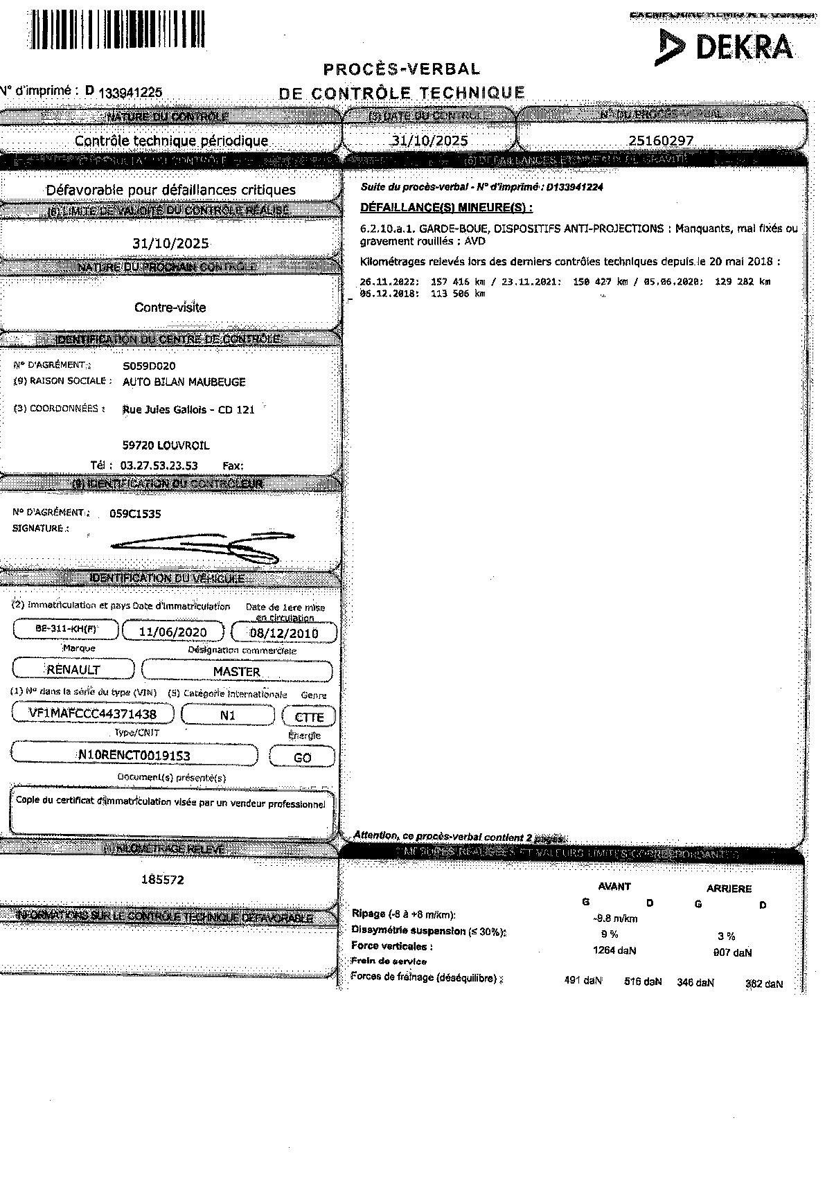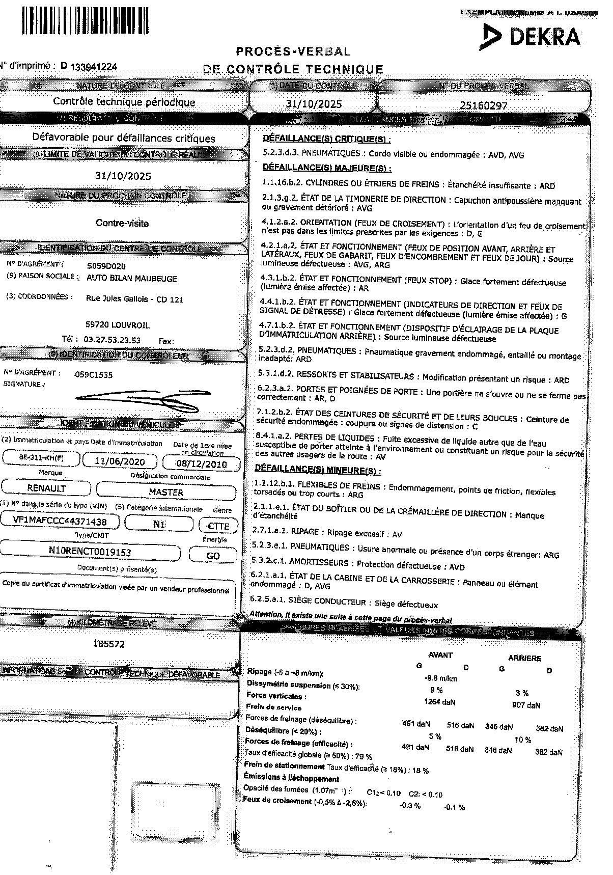RENAULT MASTER - Type : CTTE- Body : FOURGON - Energy : GO - Mileage : 185574 - 1ere M.E.C : 08/12/2010 - Puissance : 8 - Tva récupérable - Places : 3 - CHOC AVANT GAUCHE - MANQUE GARNITURE DE SERRURE PORTIERE AVANT GAUCHE - TROU PORTE LATERALE GAUCHE - CHOC HAUT PORTES ARRIERES - MANQUE POIGNET PORTE LATERALE DROITE - BOULE D'ATTELAGE - MANQUE CACHE TRAPPE A CARBURANT - RETROVISEUR GAUCHE ACCIDENTE. Following judicial liquidation, selling expenses of 14.28% ttc + 40€ HT Live expenses.