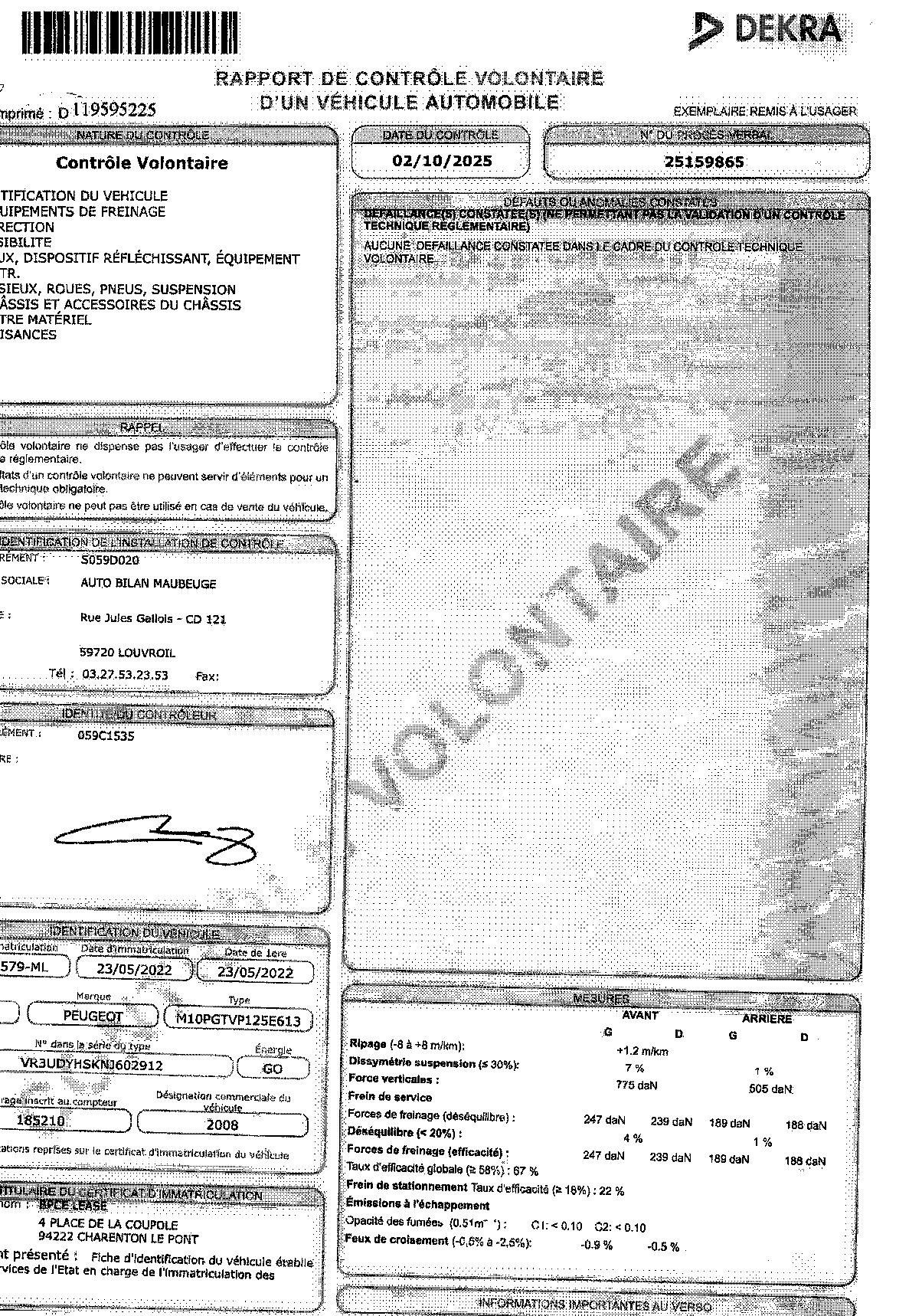 PEUGEOT 2008 BREAK - Type : VP - Body : BREAK - Energy : GO - Mileage : 185210 - 1ere M.E.C : 23/05/2022 - Power : 6 - Vat recoverable - Seats : 5 - CAMERA DE RECUL + SUR LES COTES - QUELQUES COPS ET GRIFFES. Sale on completion of leasing, voluntary charges 22.08 % inc VAT + administration costs 360€ inc VAT + Live charges 40€.