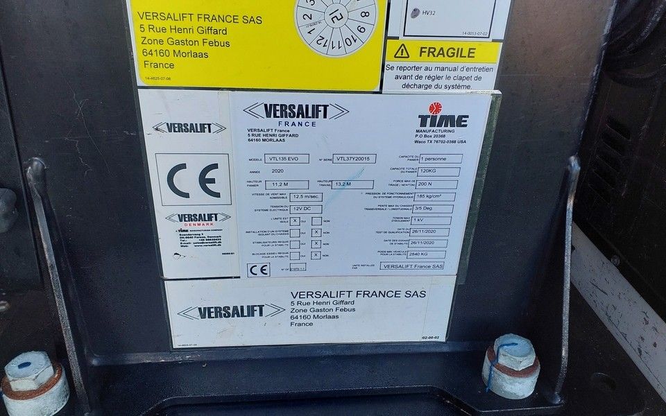 Equipment : VERSALIFT VTL 135EVO-VTL37Y20015 - 2020 - 694H-LIFT MAX 120KGS-WORKING HEIGHT 13M-REG VIT-CLIM-BOX MANUAL-SUSP. ARR SPRINGS-TYRES 225/65 R16 C-REVERSING CAMERA-LVAV-DA