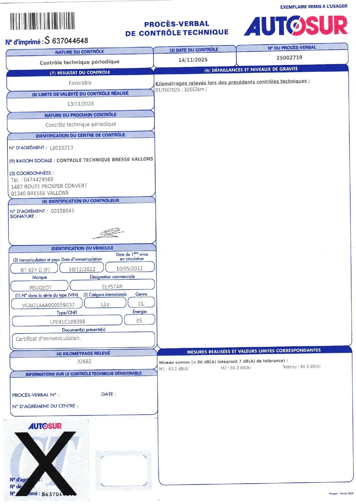 PEUGEOT - Type : CL - Body : SOLO - Energy : ES - 1ere M.E.C : 10/05/2011 - Model : ELYSTAR