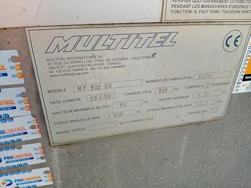 Equipment : MULTITEL MT202DS-MT202DS - SN°18658-WORKING HEIGHT 20M-CAPACITY 200KGS-STABILISERS X4-RADIO-EXTENSION-GYROPHARE-WHEELS TWIN-BV5