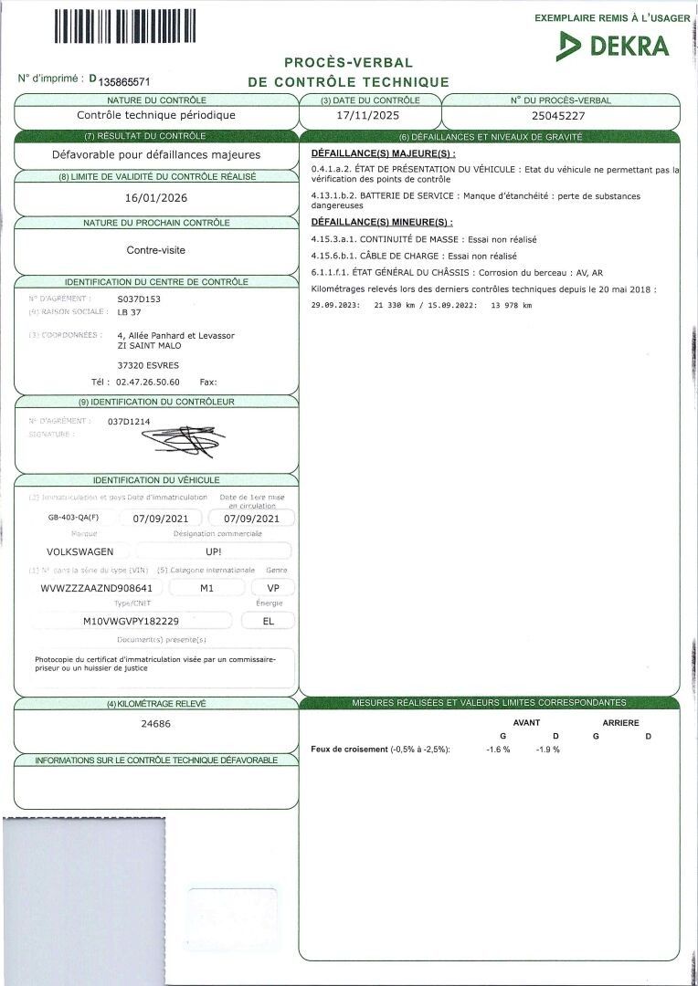 VOLKSWAGEN UP - Type : VP - Body : CI - Energy : EL - Mileage : 24686 - 1ere M.E.C : 07/09/2021 - Power : 4 - Tva récupérable - Type mines : M10VWGVPY182229 - Seats : 4