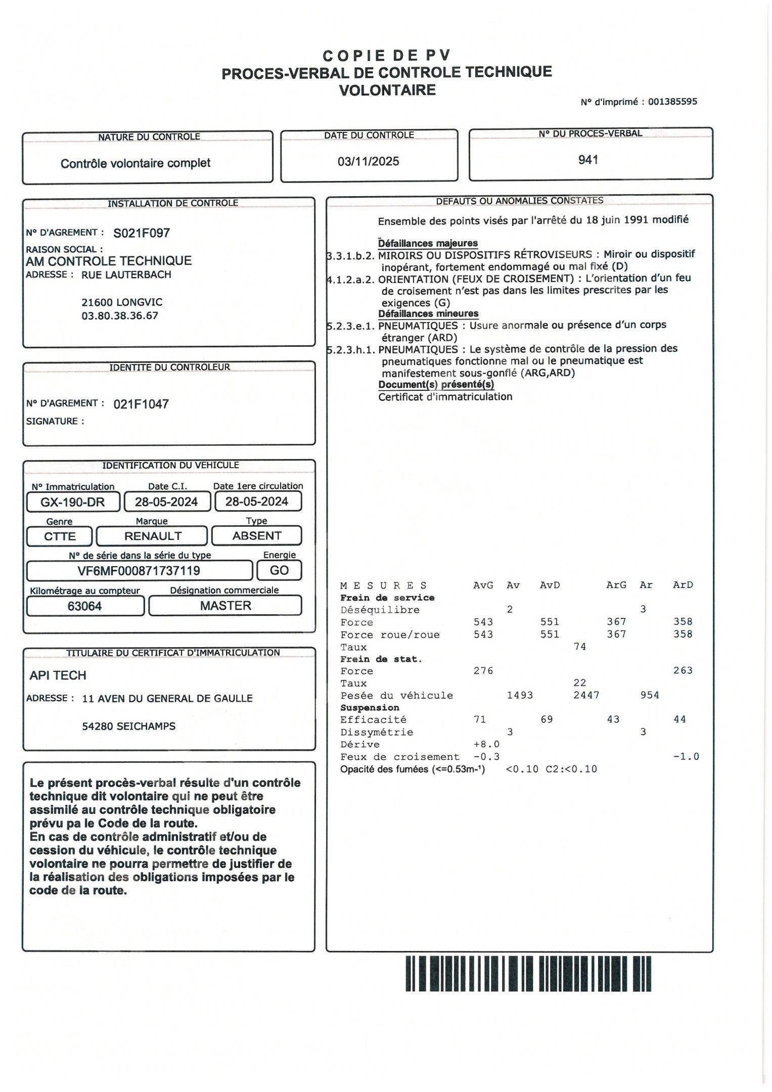 RENAULT Master FRIGO L2H2 - n° GX 190 DR - from 28.05.2024 - Type VF6MF000871737119 - n° in type series MFFM00M96U5123D3T0 - 8 CV GO -63 064 kms odometer.