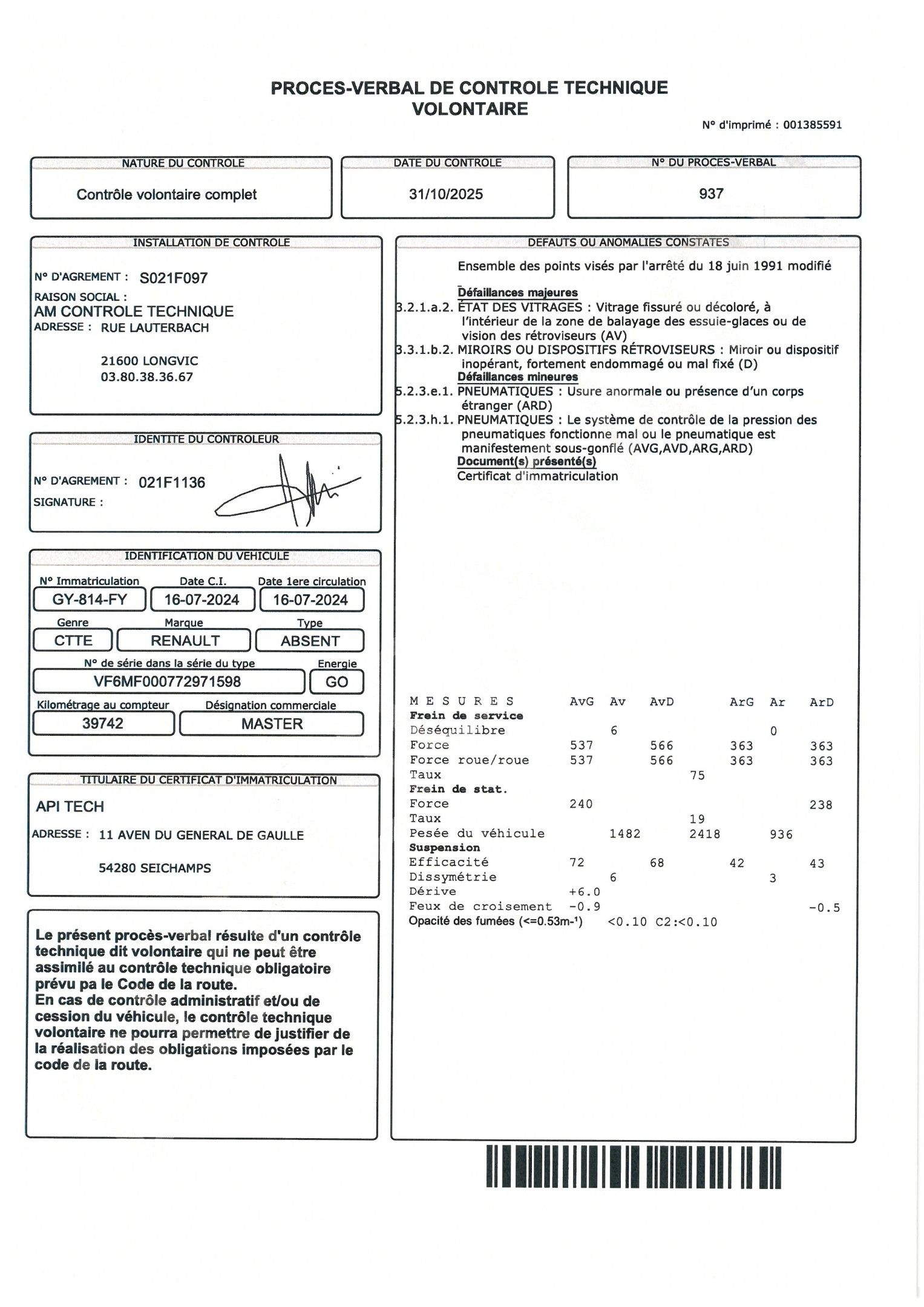 RENAULT Master FRIGO L2H2 - n° GY 814 FY - from 16.07.2024 - Type VF6MFM000772971598 - n° in type series MFFM00M96W5123D3T0 - 8 CV Go - 39 742 kms odometer.