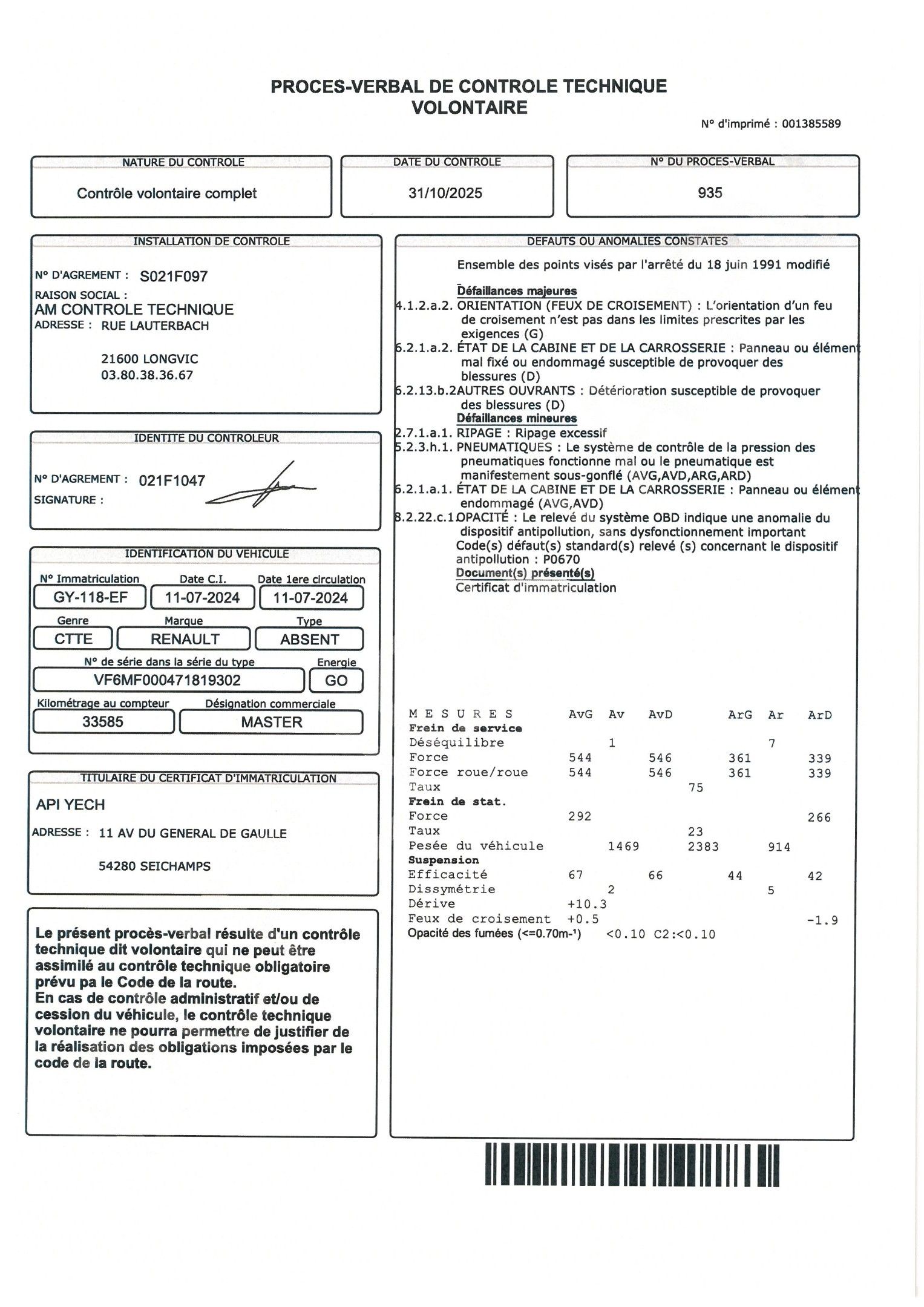 RENAULT Master FRIGO L2H2 - n° GY 118 EF - dated 11.07.2024 - Type VF6MF000471819302 - n° in type series MFFM00M96U5123D3T0 - 8 CV GO - 35 585 kms odometer.