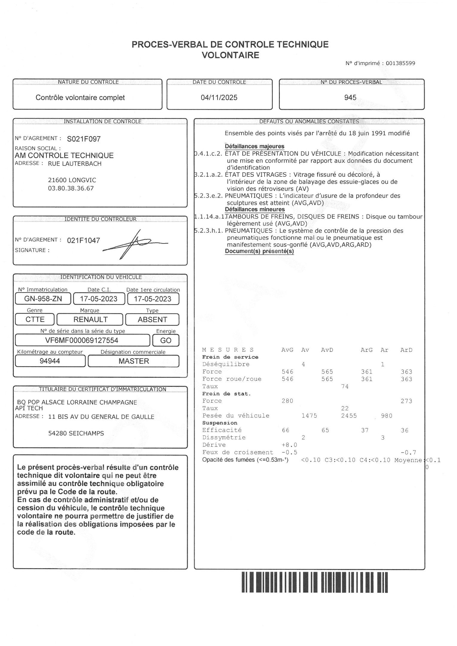RENAULT Master FRIGO L2H2 - n° GN 958 ZN - from 17.05.2023 - Type MFFM00M96UZ123D3T0 - n° in type series VF6MF00069127554 - 8 CV GO - 94 943 kms odometer.