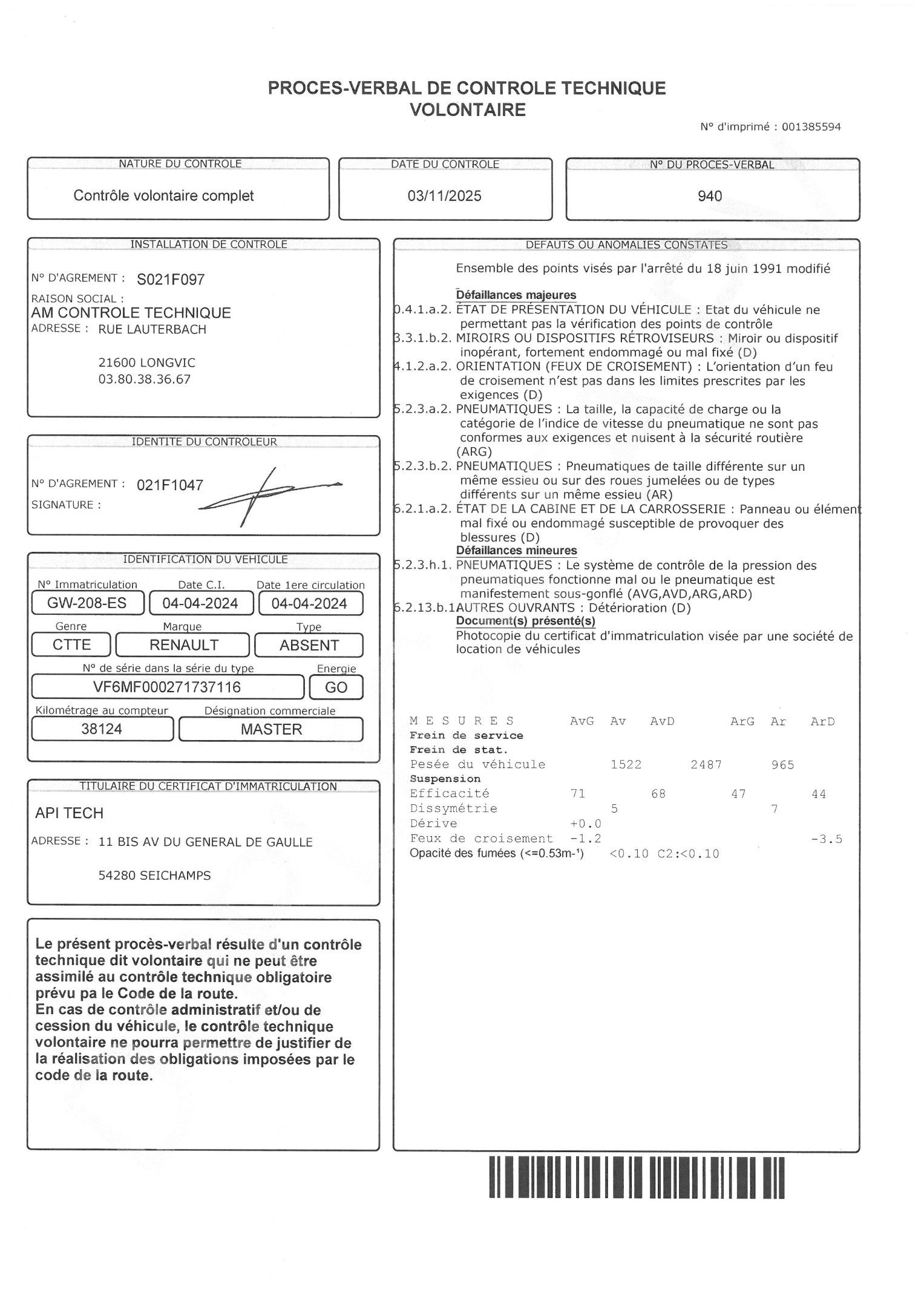 RENAULT Master FRIGO L2H2 - n° GW 208 ES - from 04.04.2024 - Type VF6MF000271737116 - n° in type series MFFM00M96U5123D3T0 - 8 CV GO - 38 124 kms odometer.