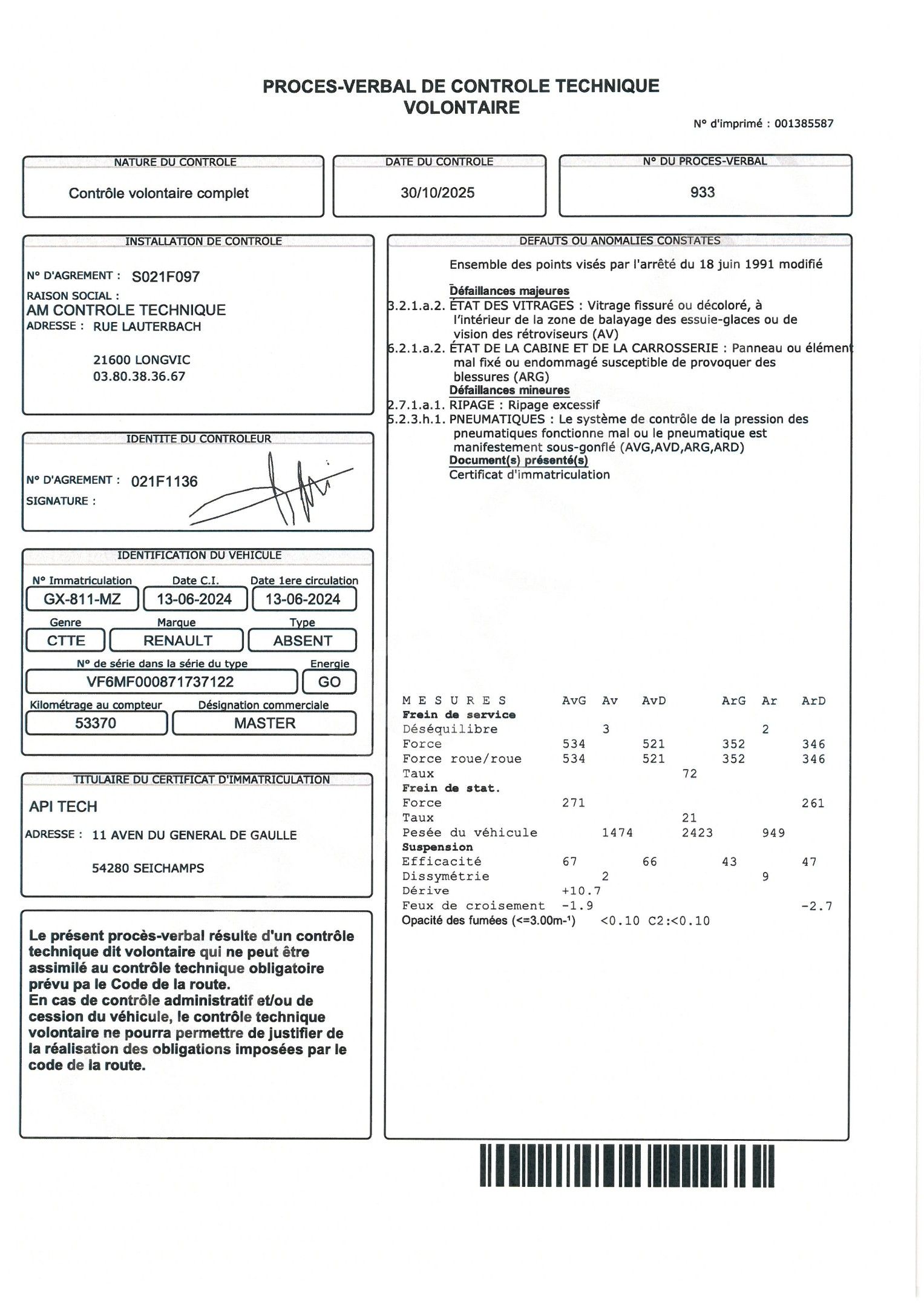 RENAULT Master FRIGO L2H2 - n° GX 811 MZ - dated 13.06.2024 - Type VF6MF000871737122 - n° in type series MFFM00M96U5123D3T0 - 8 CV GO - 53 370 kms odometer
