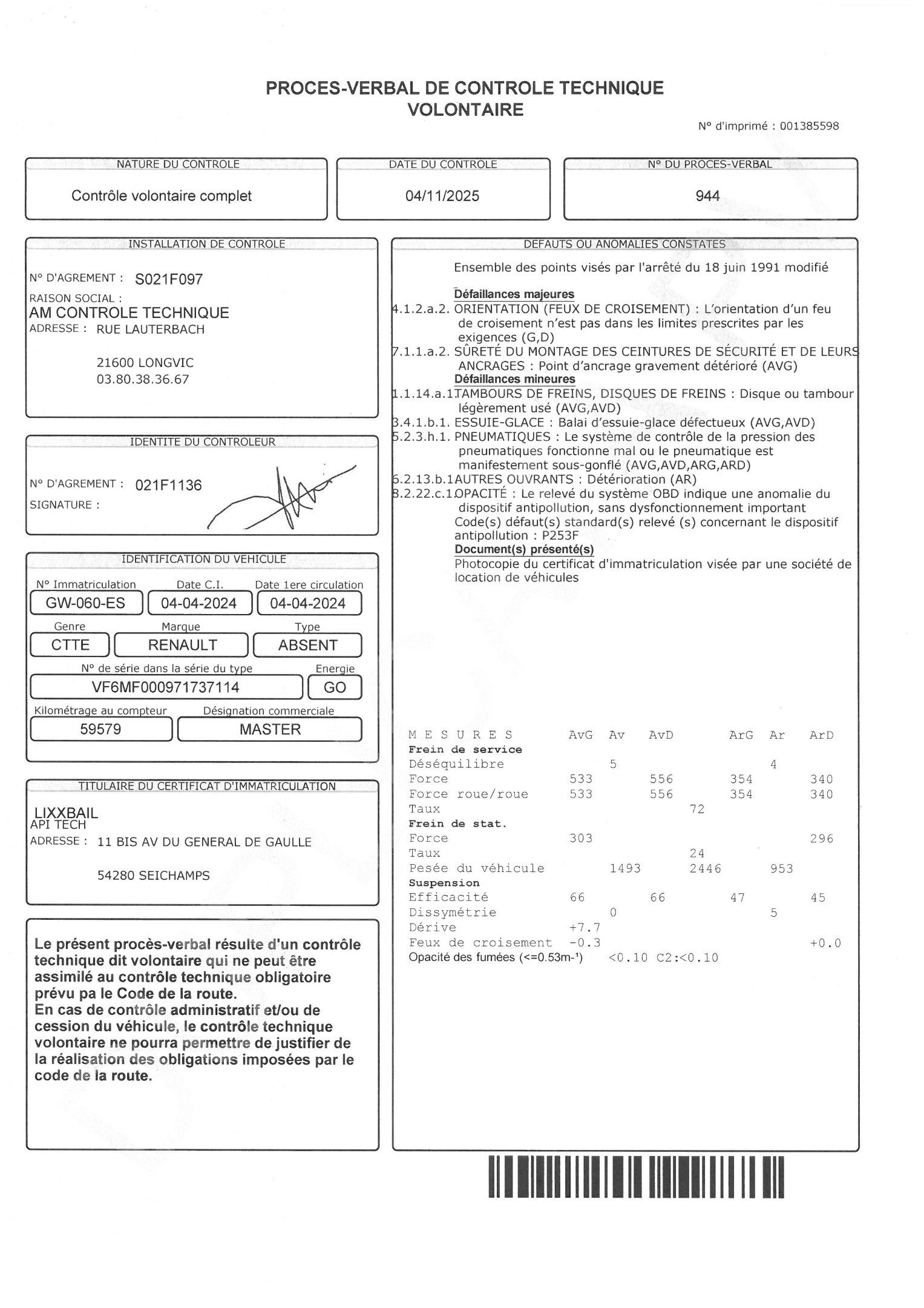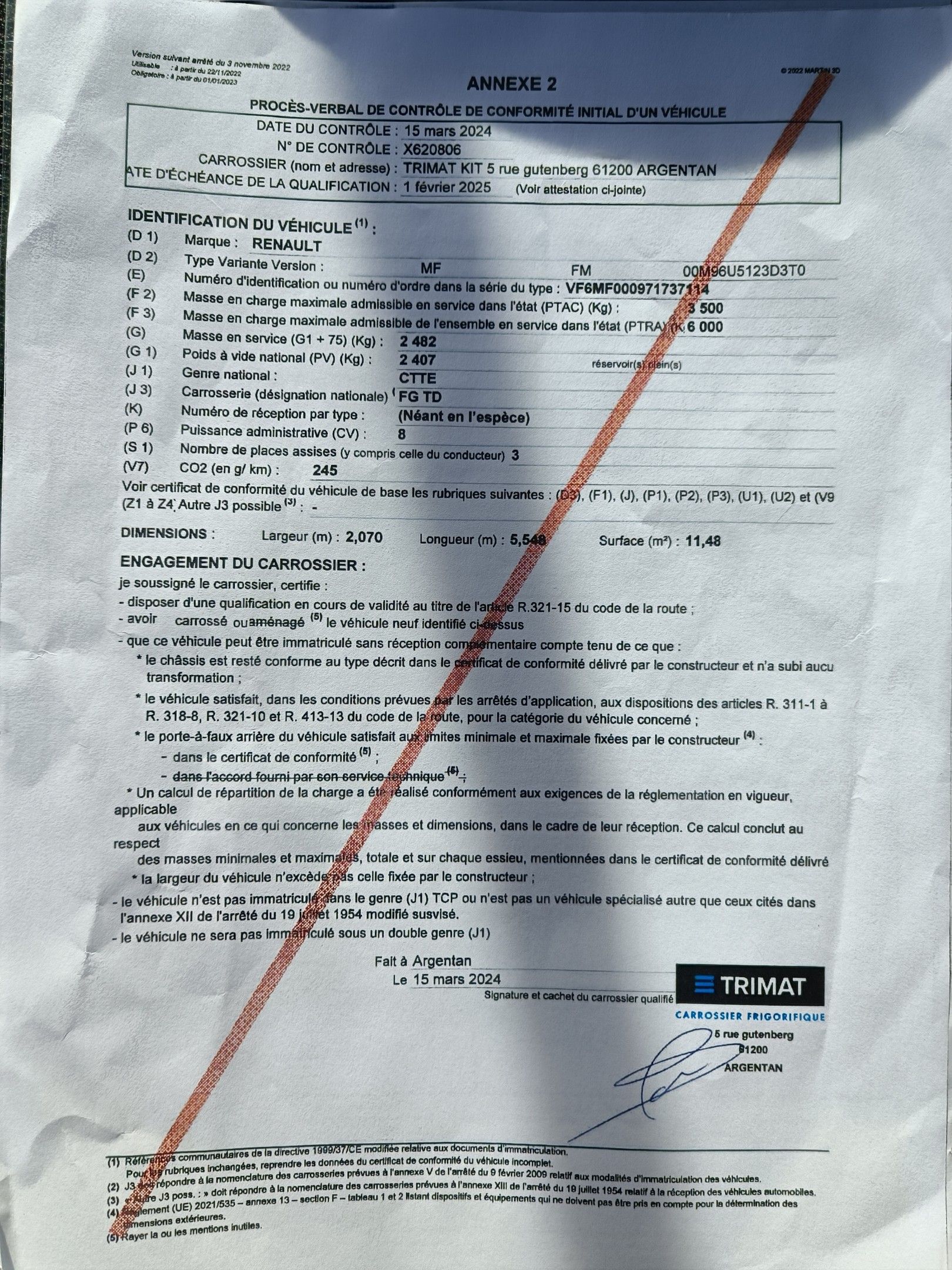 RENAULT Master FRIGO L2H2 - n° GW 060 ES - from 04.04.2024 - Type VF6MF0009731737114 - n° in type series MFFM00M96U5123D3T0 - 8 CV GO - 59 579 kms odometer.