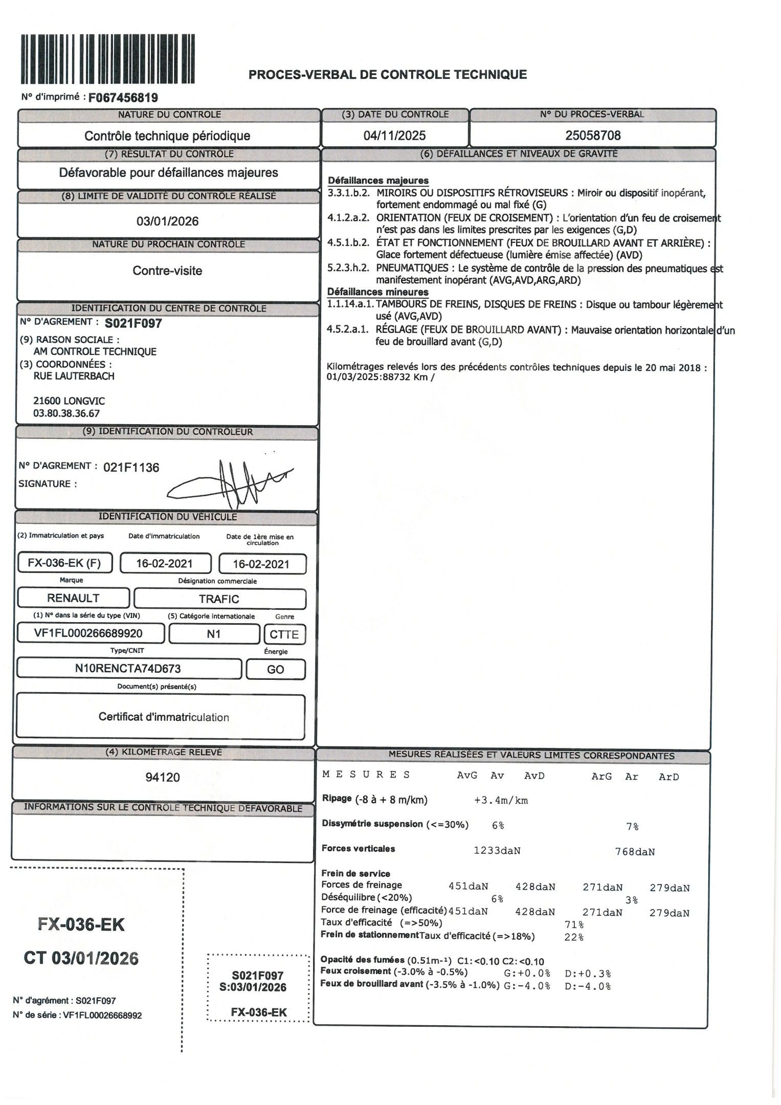 RENAULT Trafic - n° FX 036 EK - From 16.02.2021 - Type LFAM9RML6TAJ110A00 - n° in type series VF1FL000266689920 - 7 CV GO - 94 120 kms odometer.