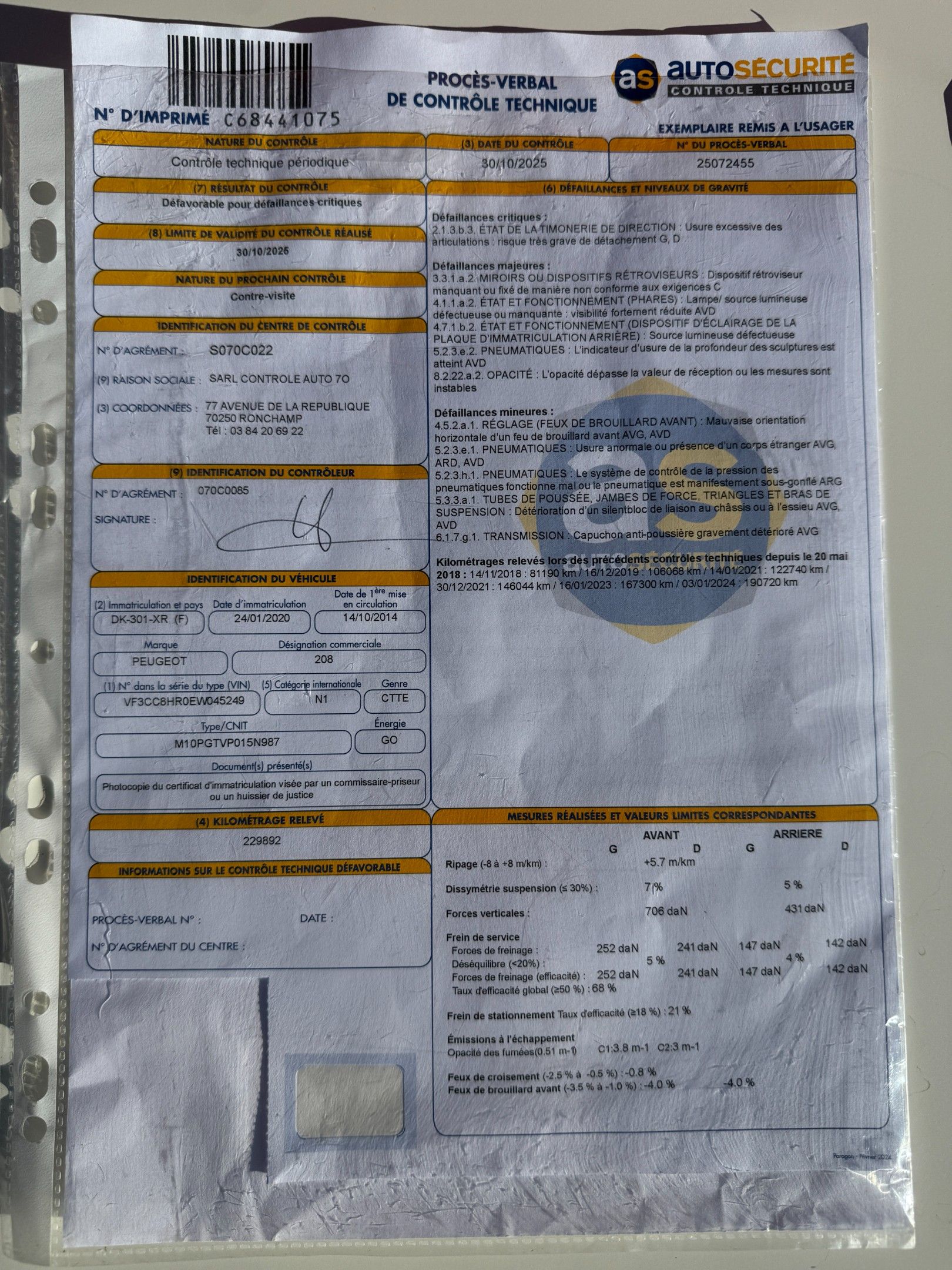 Deriv VP PEUGEOT 208, G0, 6CV, Imm. DK-301-XR of 14/10/2014 - 230,000 km. Charges 14.28% inc VAT + €568 inc VAT (recoverable VAT).