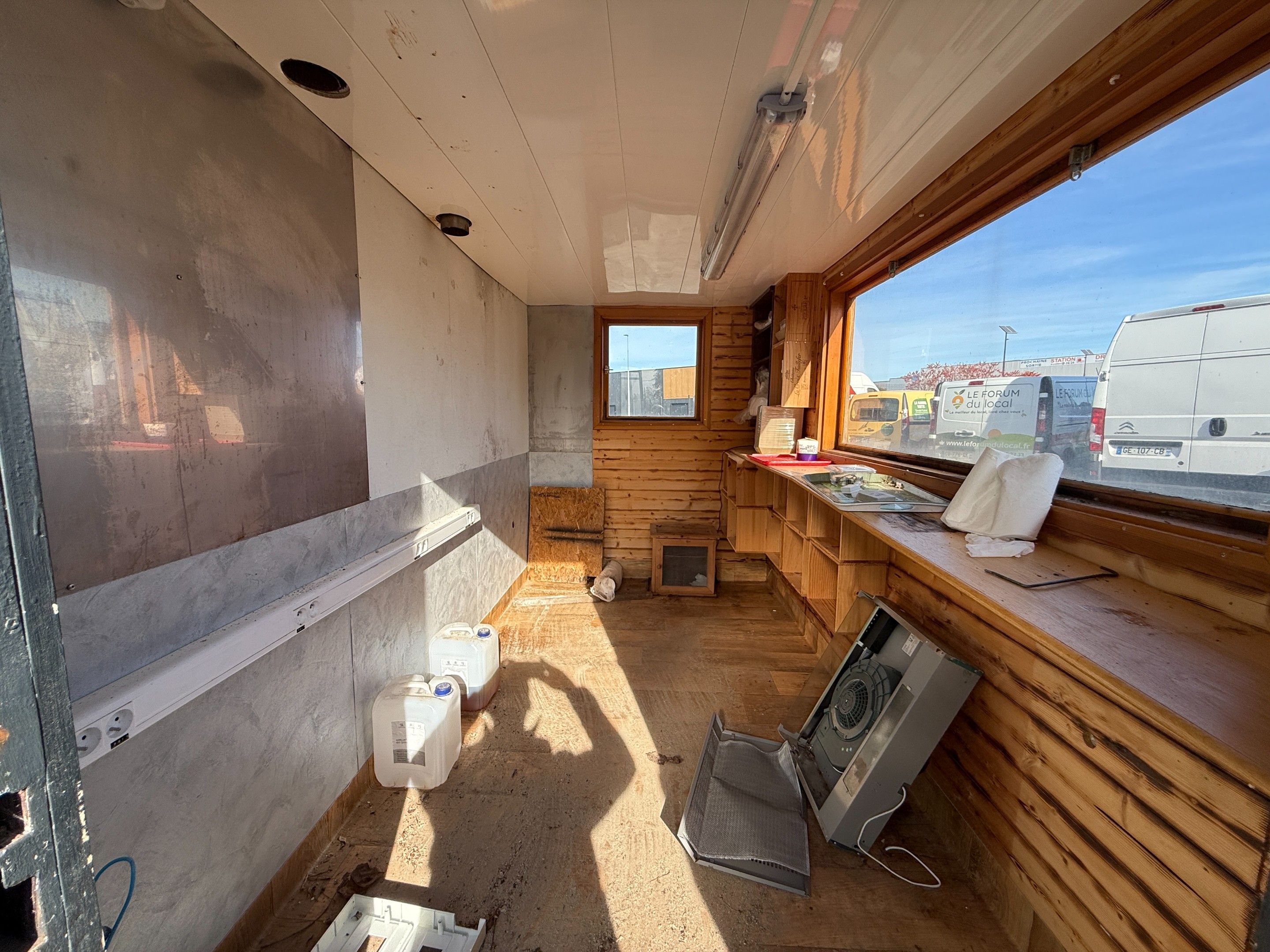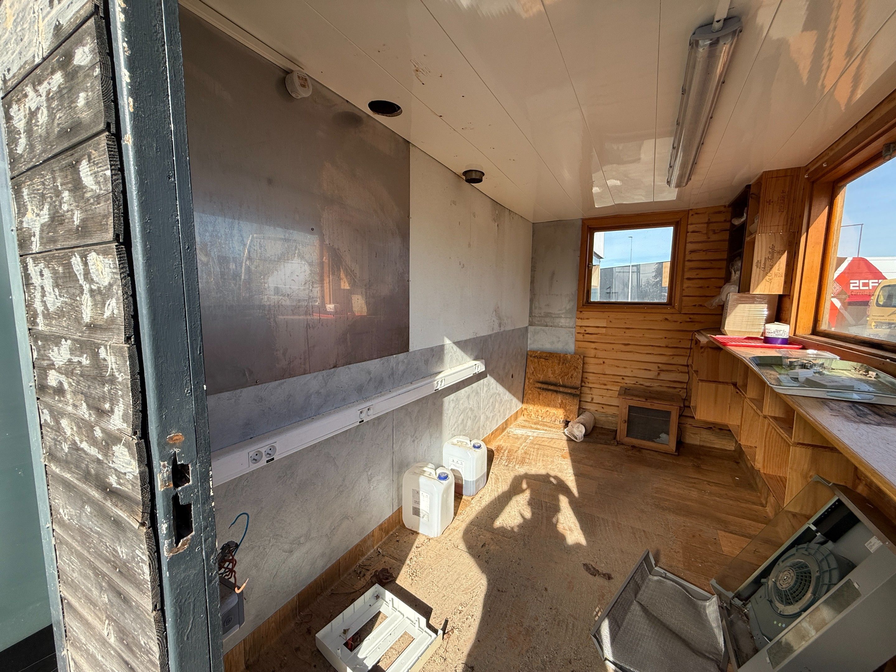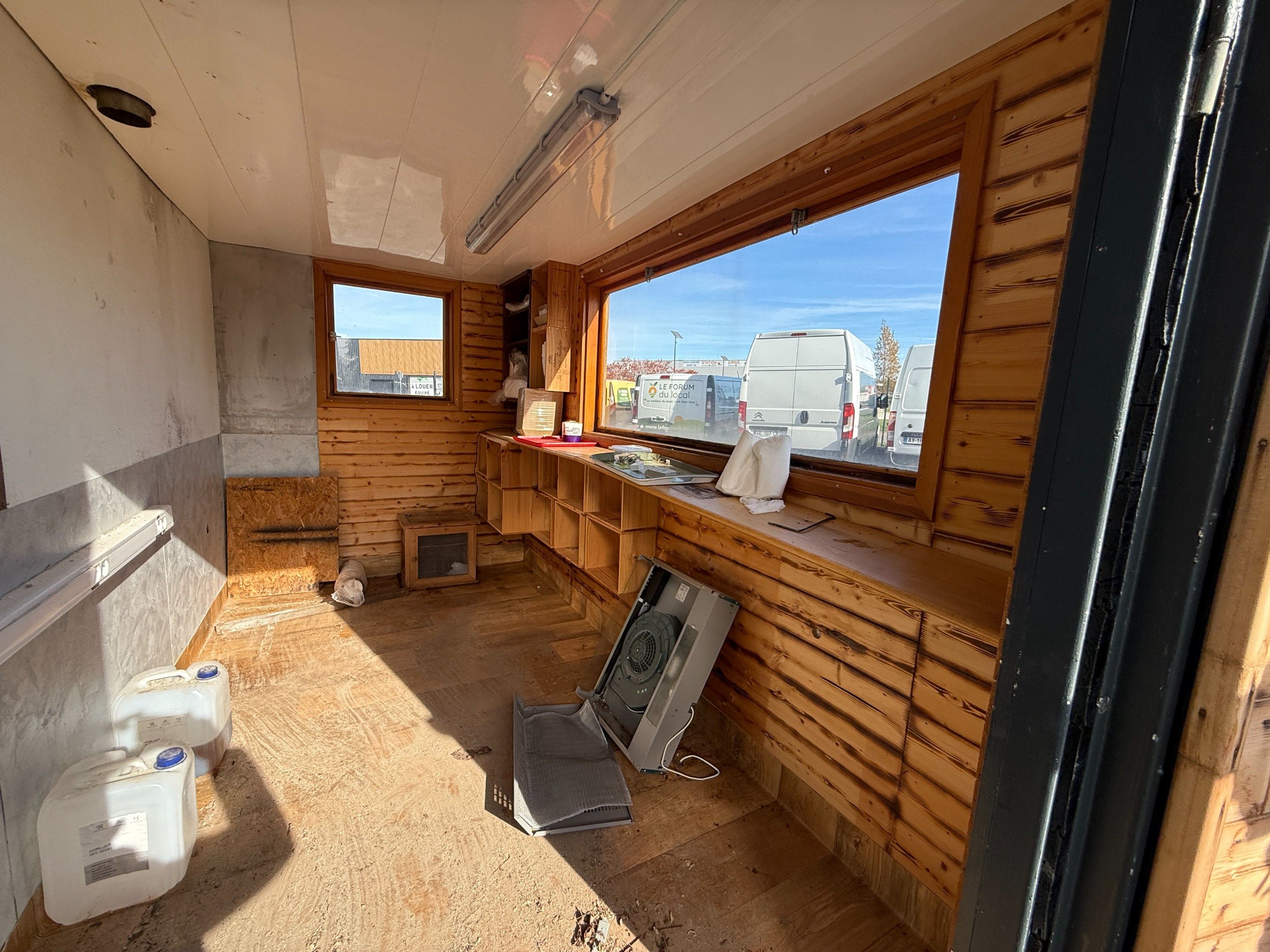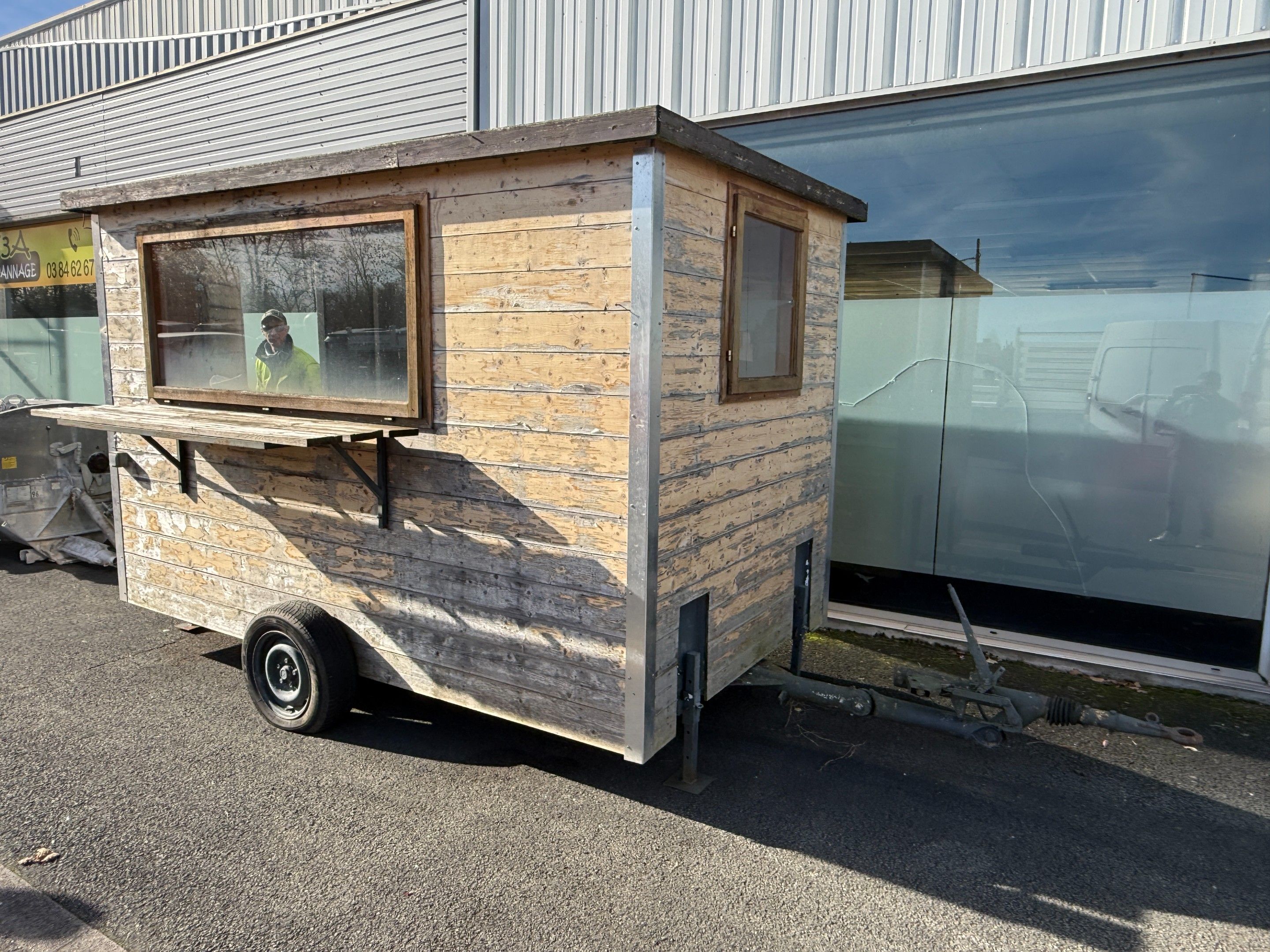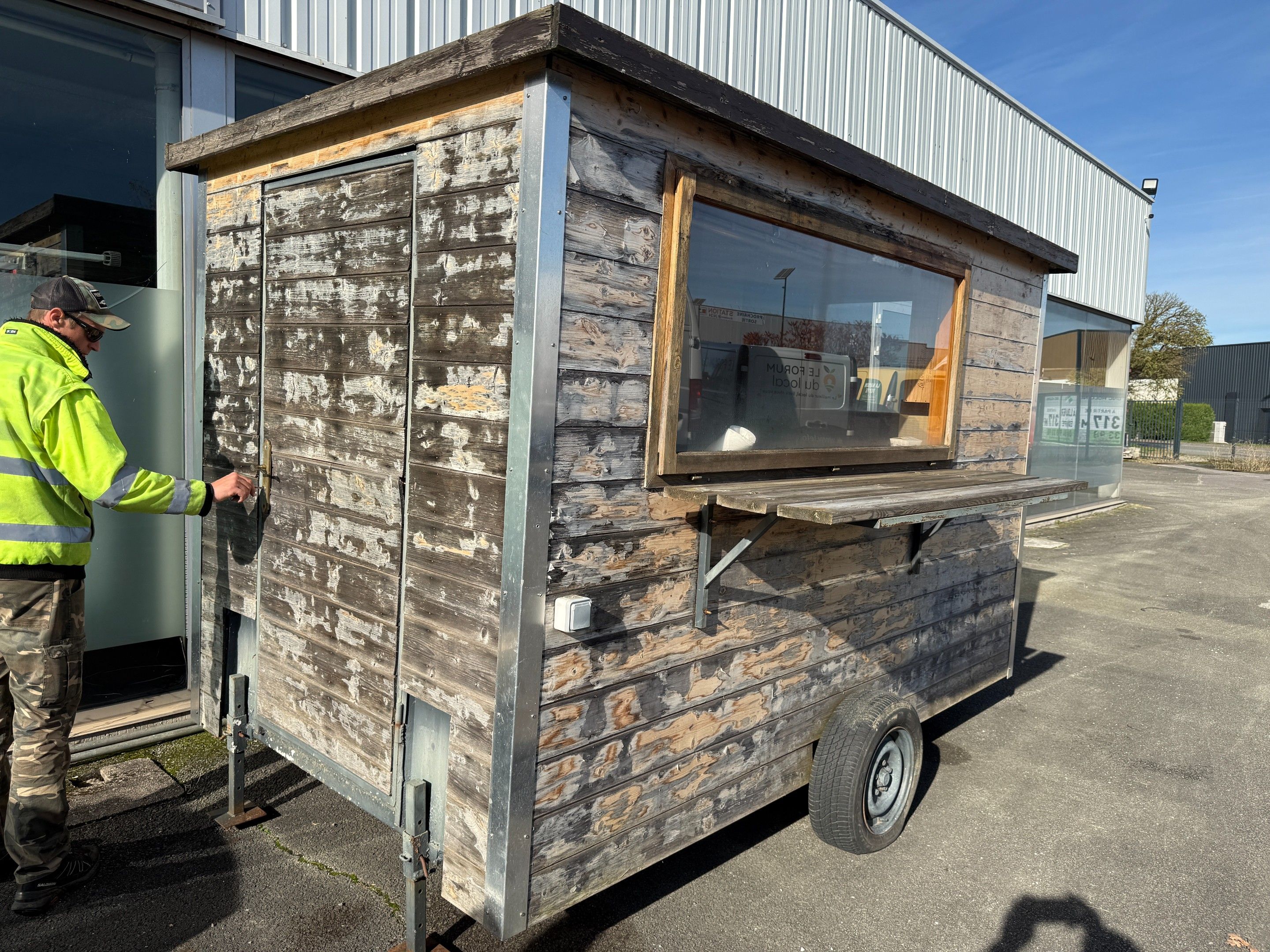 Construction site hut on axle modified into a traditional food truck. Charges 14.28% incl. VAT + €390 incl. VAT (recoverable).