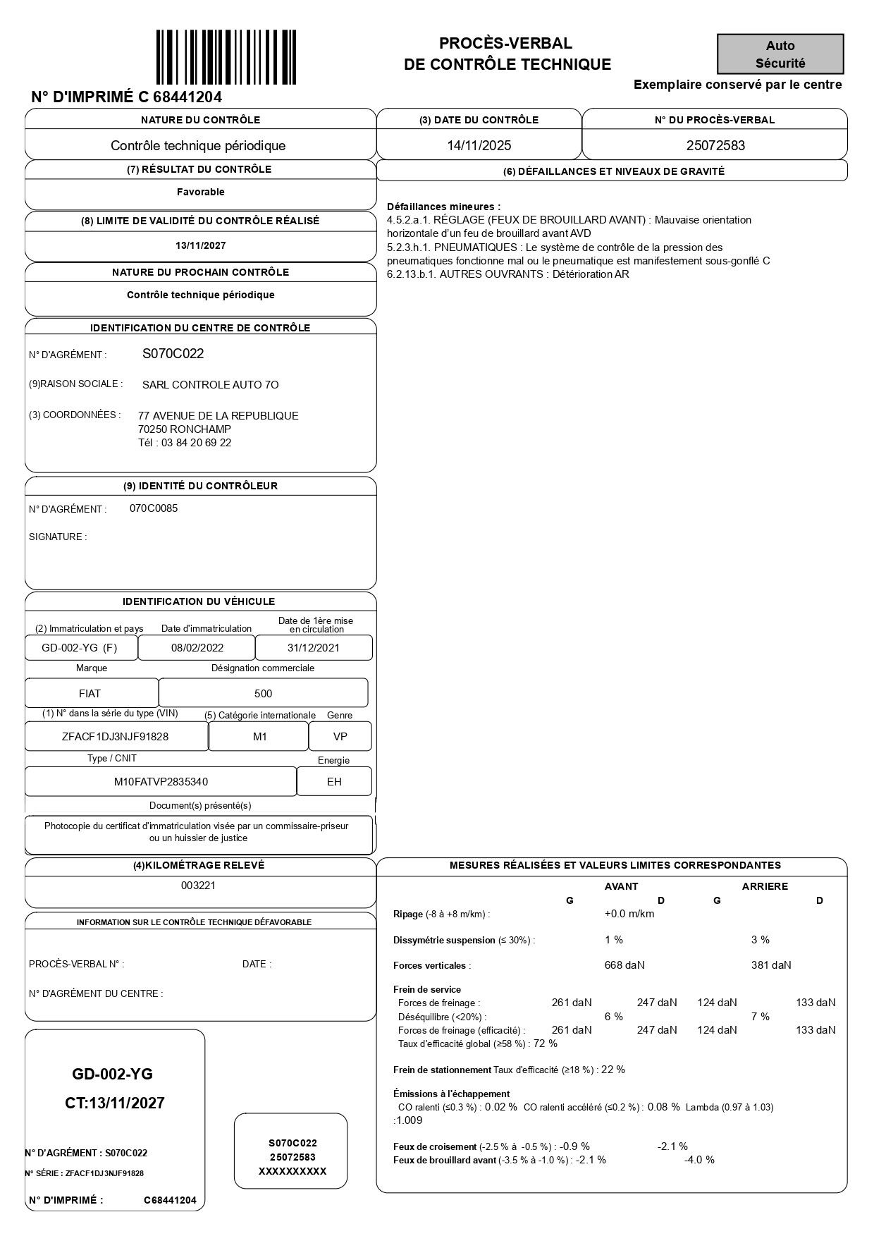 CTTE FIAT 500, hybrid, EH, 4CV, Imm. GD-002-YG of 31/12/2021 - 3 221 Km. No registration document, FIV (vehicle identification card) . Charges 14.28% inc VAT + €532 inc VAT (non-recoverable VAT).