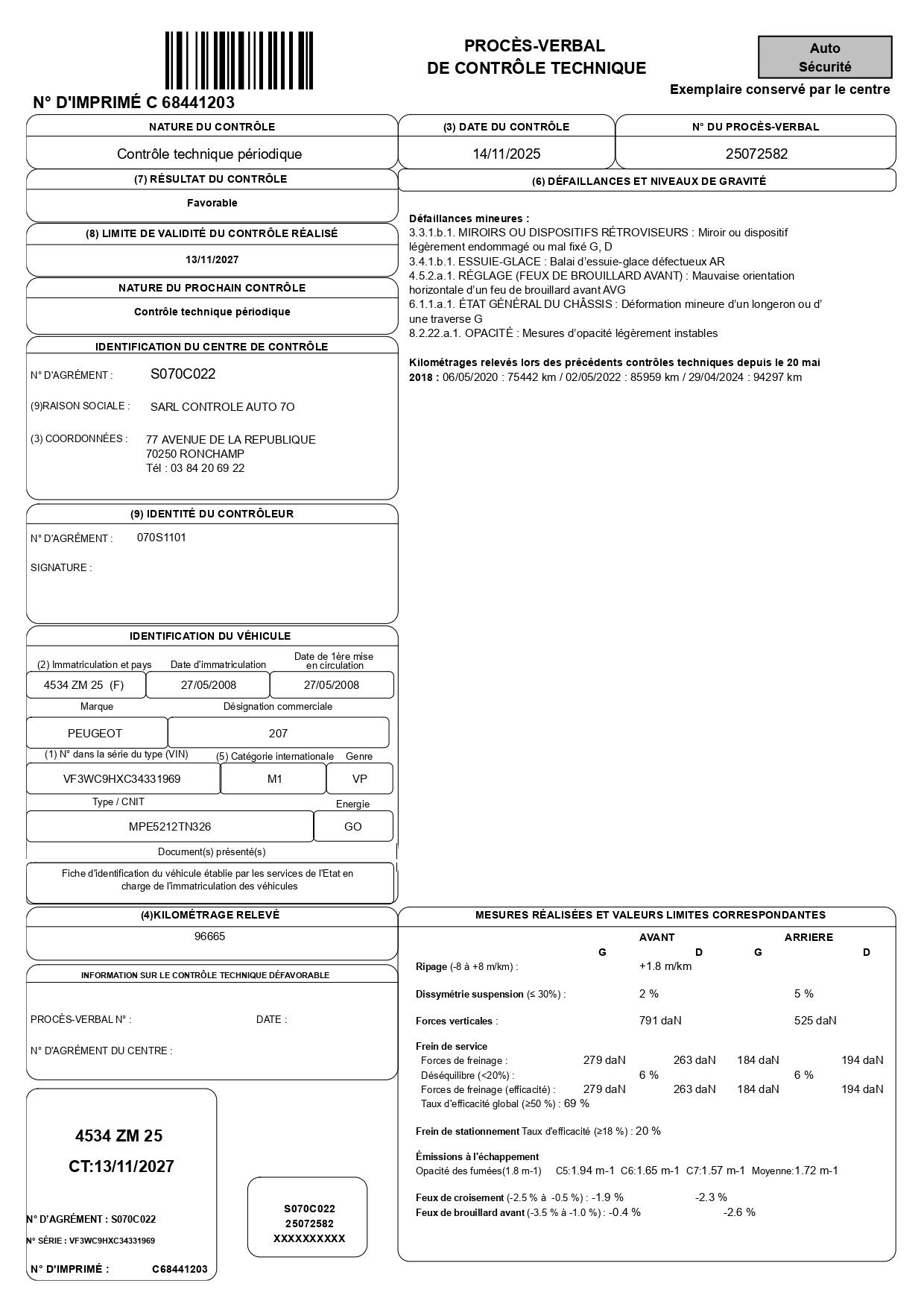 VP PEUGEOT 207, GO, 5CV, Imm. 4534 ZM 25 of 27/05/2008 - 96 665 Km. No registration document, FIV (vehicle identification card). Charges 14.28% inc VAT + €376 inc VAT (non-recoverable VAT).