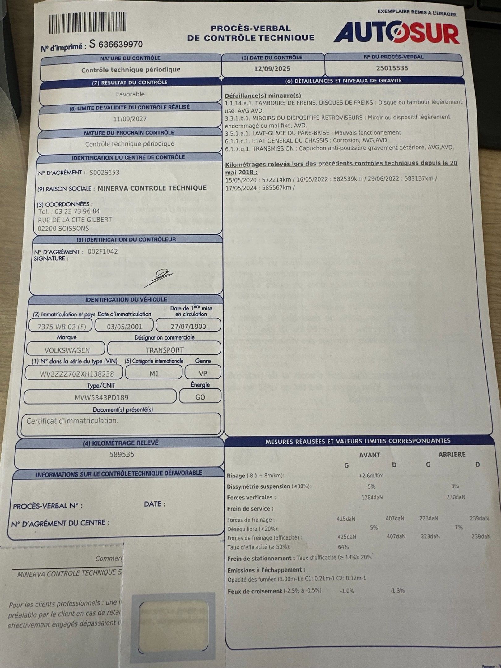 Suite défaut paiement acheteur - VP BREAK VOLKSWAGEN Modèle : TRANSPORTEUR T4 2,5 TDI 102CV 7375 WB 02 Type constructeur : MVW5343PD189 N°de Série : WV2ZZ70ZXH138238 Date de 1ere mise en service 27/07/1999 Energie : GO Puissance : 7 Kilomètres Compteur non garantis : 589538 Contrôle Technique : Oui Couleur : BLANC