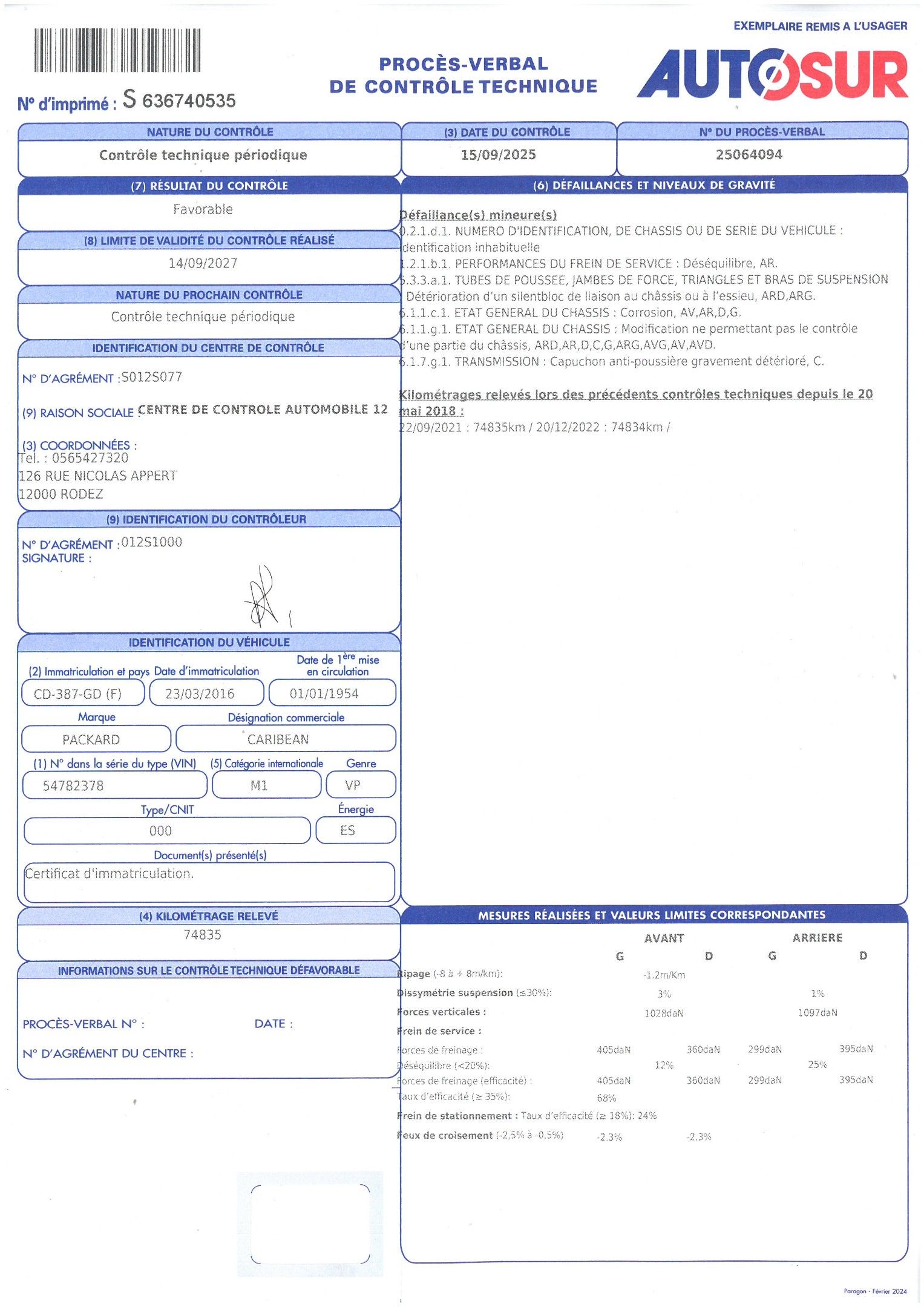 odometer in miles - normal French registration document - owner for around 10 years - vehicle not widely distributed - around 400 examples between 1953 and 1956 - 8 cylinders in line 5.9 litres - + 13,000 euros in invoices - 2020 expert report available on request by email - registered with the Packard America Club - functional vehicle last CT 2023 with tyres replaced at that time - selling expenses 14.4% - starting price 20,000 euros