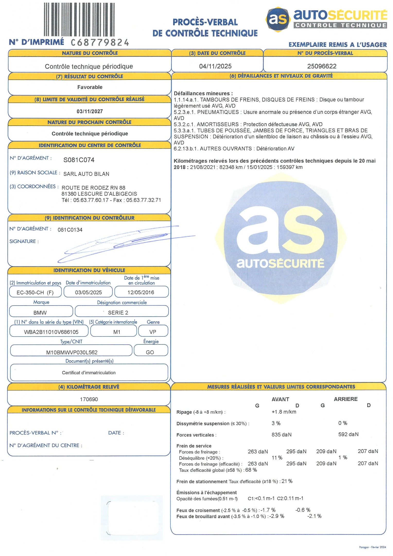 PC BMW SERIE 2 (F45) ACTIVE TOURER 214D 1.5 D 12V 95 CV - Registration: EC-350-CH