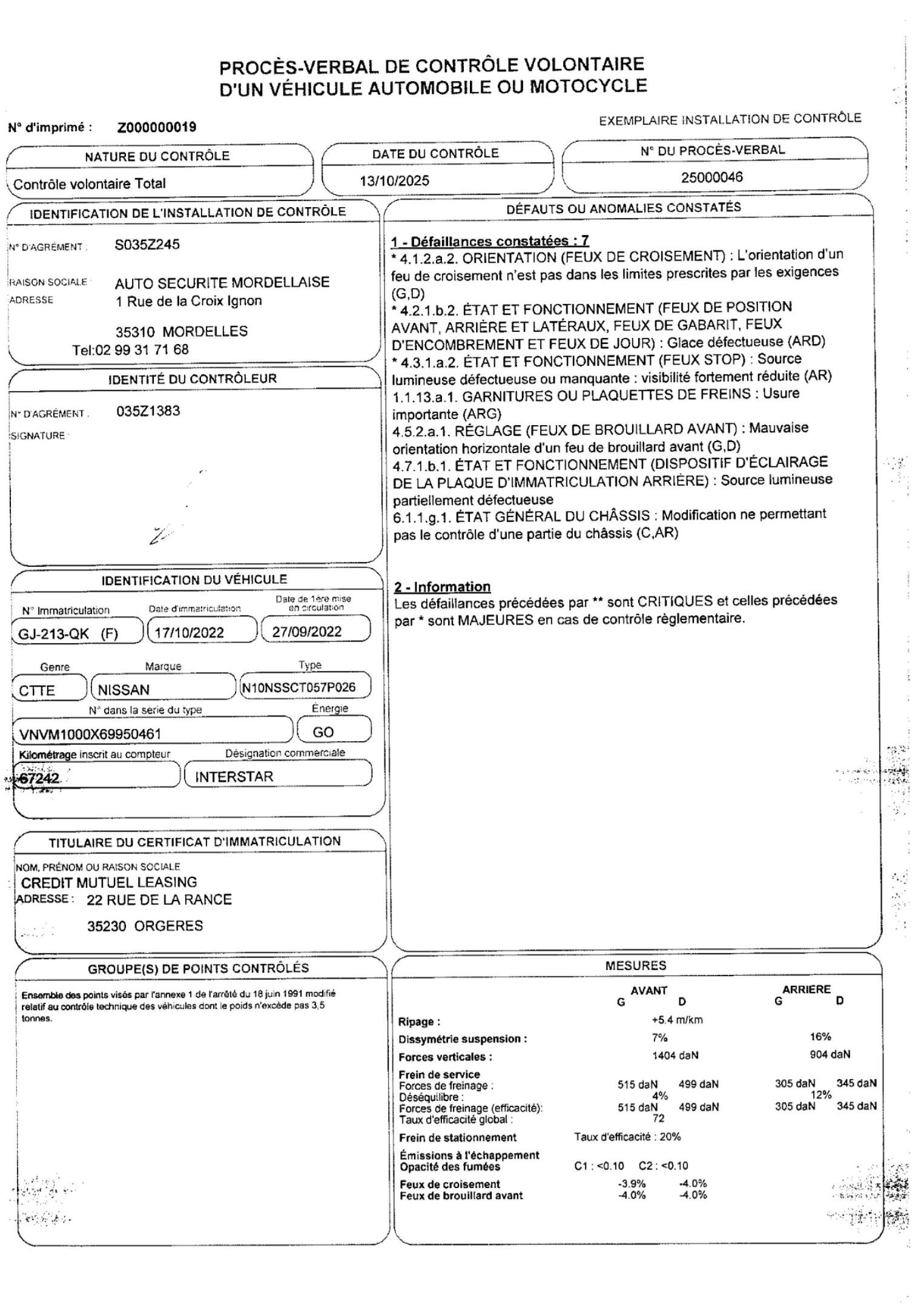 NISSAN INTERSTAR 2.3 DCI TURBO 150CV - Registration: GJ-213-QK - Type: CTTE - Body: FOURGON - Energy: GO - Colour: WHITE - Odometer reading: 67242 - 1ere M.E.C: 27/09/2022 - Power: 8 - VAT recoverable - Seats: 3 - Remarks : 6 SPEED MANUAL GEARBOX
