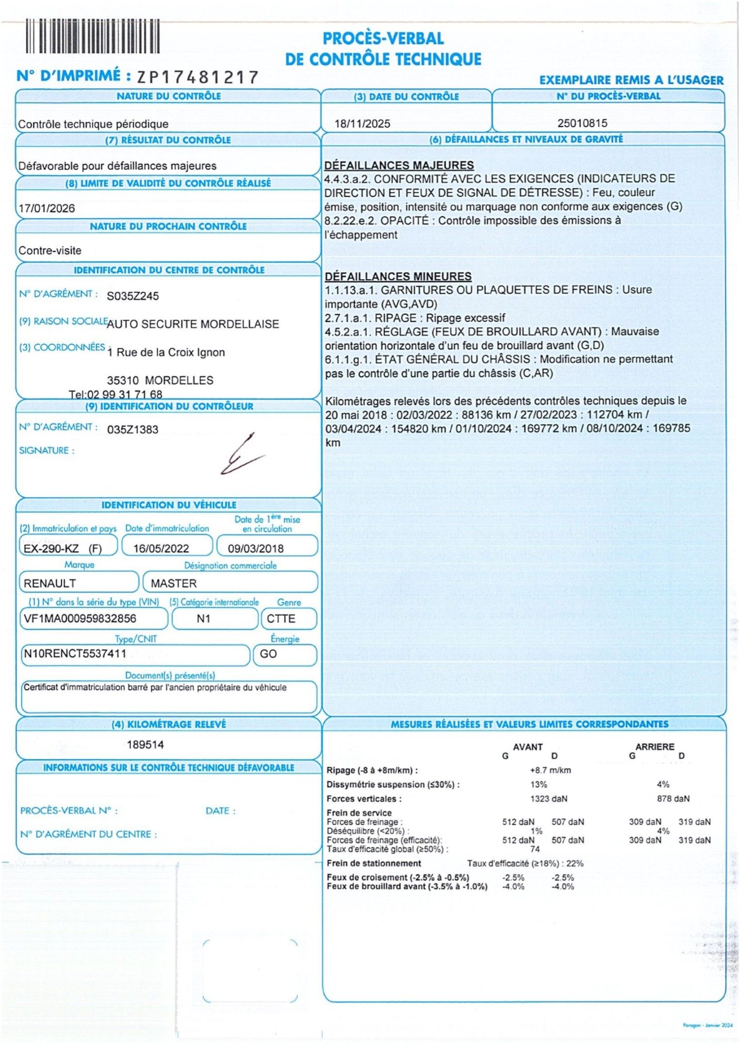 RENAULT MASTER DCI 170 ENERGY - Registration: EX-290-KZ - Type: CTTE - Body: FOURGON - Energy: GO - Color: WHITE - Mileage: 189514 - 1ere M.E.C: 09/03/2018 - Power: 8 - VAT recoverable - Seats: 2 - Remarks: CG IN THE NAME OF THE FORMER OWNER
