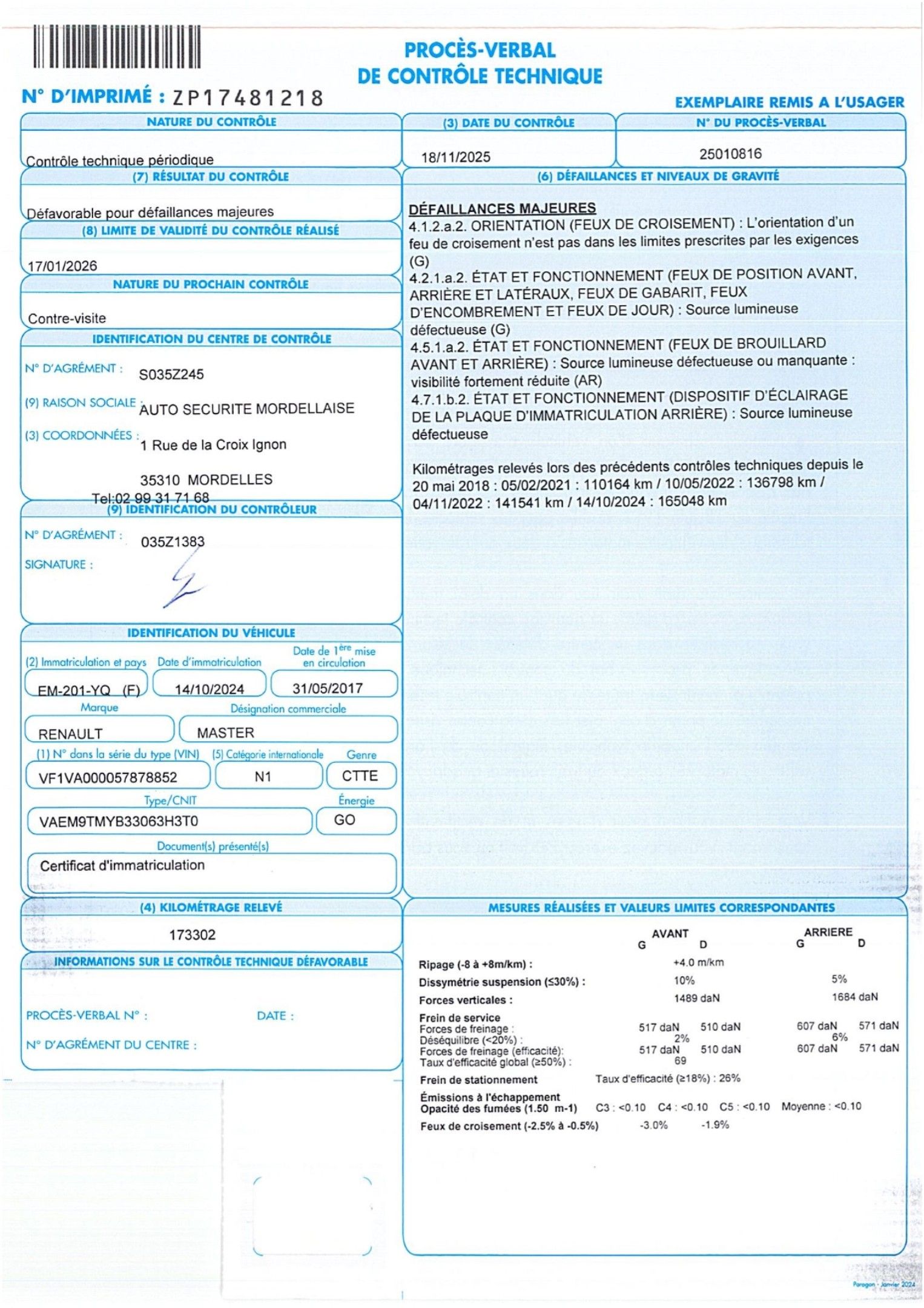 RENAULT MASTER 2.3 BLUE DCI TURBO 170 CV - Registration: EM-201-YQ - Type: CTTE - Body: FOURGON - Energy: GO - Color: BLACK - Mileage: 173291 - 1ere M.E.C: 31/05/2017 - Power: 8 - Tva récupérable - Observations : PLEDGED VEHICLE TIME NEEDED TO OBTAIN PAPERS