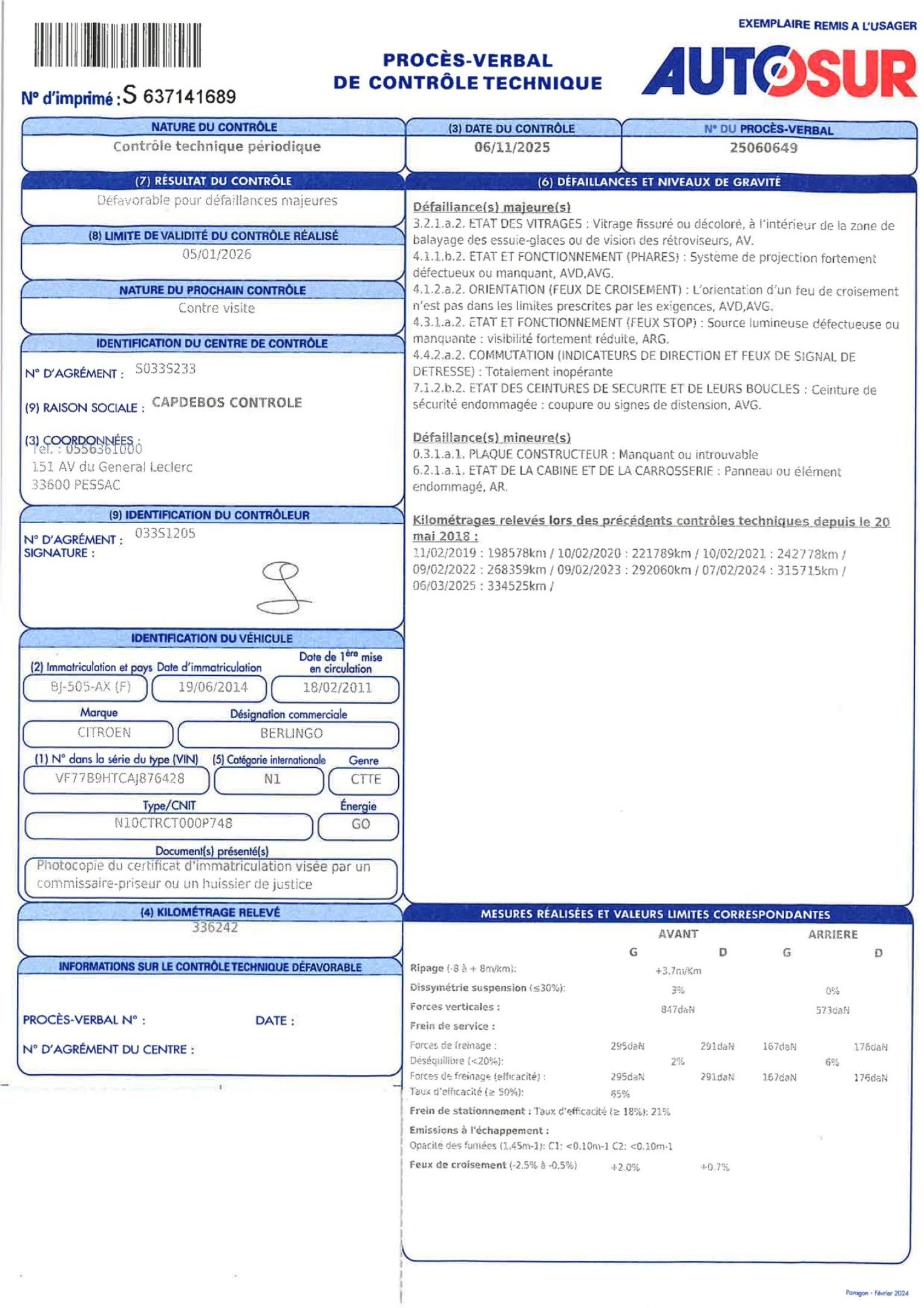 BERLINGO CITROEN BERLINGO - Type : CTTE - Body : FOURGON - Energy : GO - Color : BLANC - Mileage : 336238 - 1ere M.E.C : 18/02/2011 - Power : 5 - Type mines : N10CTRCT000P748 - Seats : 3 - Length : 438 - Width : 181 - Height : 180 - Remarks : *** Selling expenses 15 % + administrative expenses 200 € TTC + LIVE FEES IF INTERRUPTED 48 € TTC ***