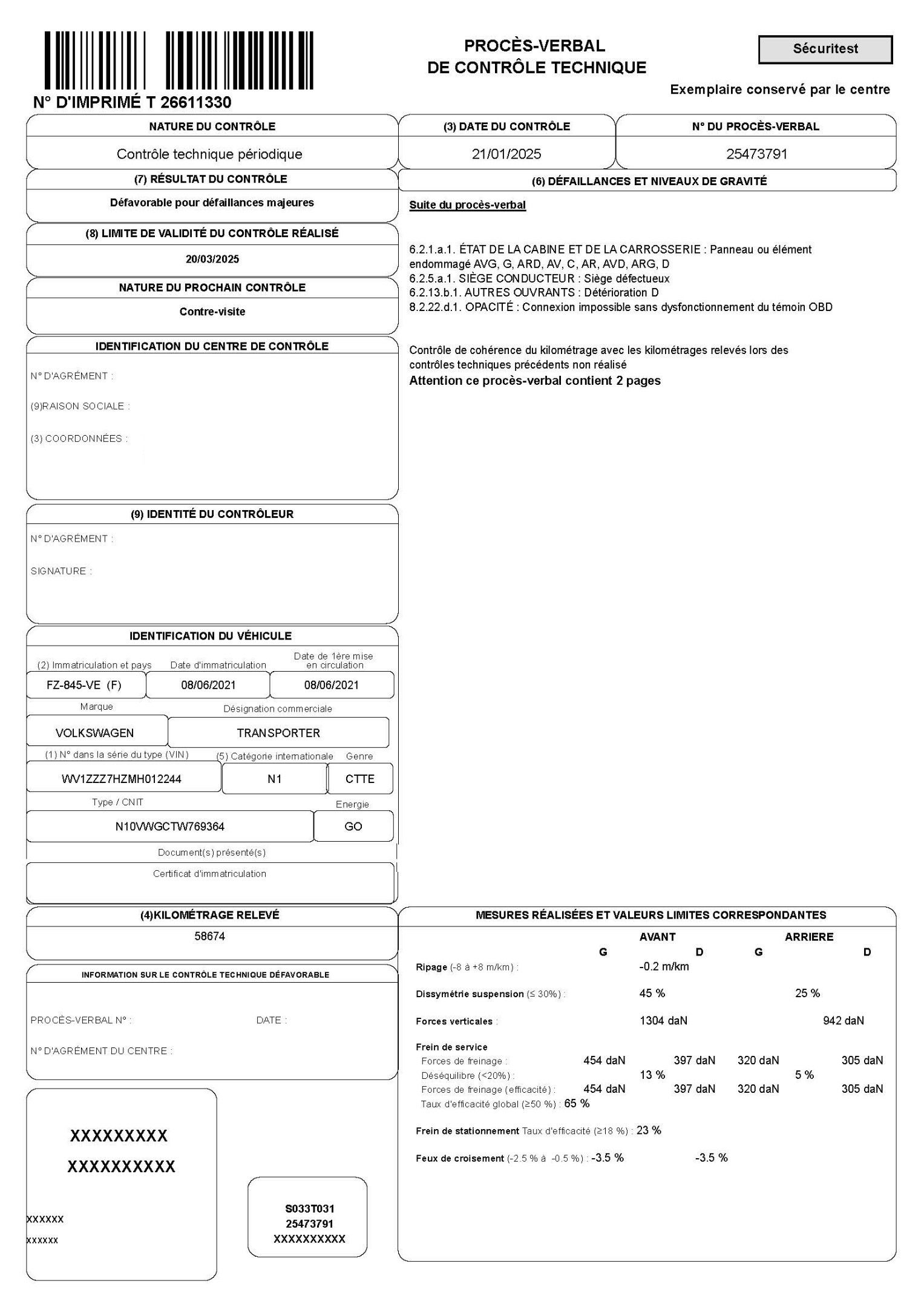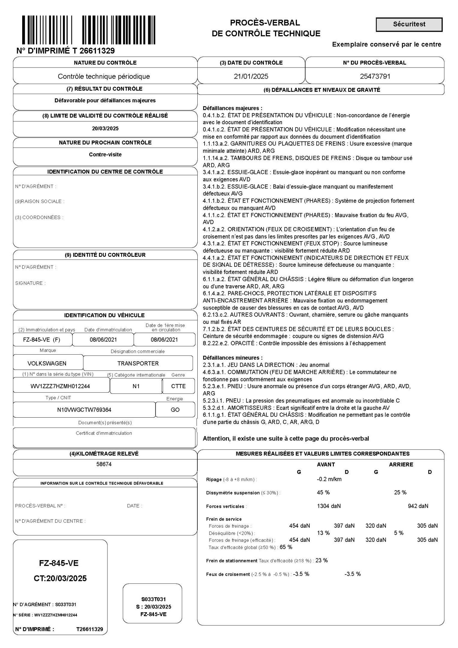 CTTE VOLKSWAGEN TRANSPORTER LCV MODÈLE : T6 1 ABT 82KW. ELECTRIC - Registration number : FZ-845-VE - Mileage : 58674 KMS - 1st M.E.C : 08/06/2021 - Power : 7 hp - Seats : 3 - Sold with 2 keys - Important : The vehicle is electrically powered, although the registration document incorrectly states "GO" (diesel). This inconsistency is noted in the technical inspection report, line 0.4.1.b.2, indicating a mismatch between the energy and the registration certificate. The successful bidder will have to regularise the vehicle registration document with the ANTS. The condition of the vehicle shows the absence of the electric charging cable, two punctured wheels and bodywork in poor condition. The validity of the roadworthiness test is limited to 20 March 2025, after which it has been overwritten. The vehicle is sold NOT ROLLING (unidentified fault) - Observation: Vehicle sold as is, without warranty, in accordance with the observations of the roadworthiness test. VAT RECOVERABLE - VOLUNTARY RATE: 18% incl. VAT, plus a fee of €40 excl. VAT per vehicle if purchased via Interencheres Live. The cost of the technical inspection is €45.83 excluding VAT, i.e. €55 including VAT. The vehicle is sold with its registration document. It is the responsibility of the successful bidder to complete all the administrative formalities required to change the holder of the vehicle registration document with the ANTS.
