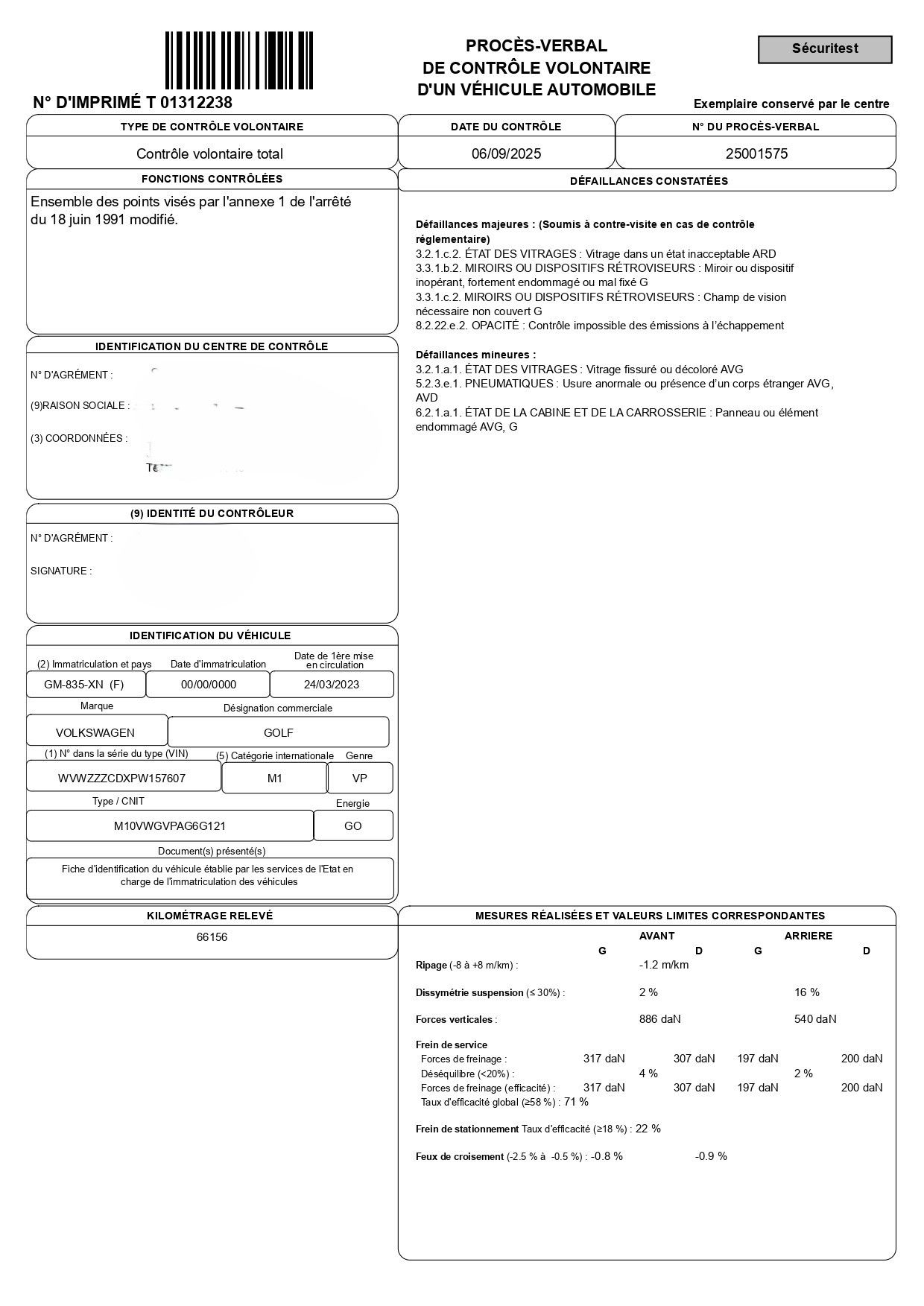 VASP (DERIV VP) VOLKSWAGEN GOLF - 2.0 TDI SCR 116. Registration number GM-835-XN, odometer: 66,156 kms. First put into service on 24 March 2023, diesel (GO), manual gearbox, 6 bhp tax rating - 2 seats. The vehicle is delivered with a single key. It is sold as is, without warranty, in accordance with the observations of the technical inspection carried out on 06/09/2025 - The bodywork has a few visible scratches - The vehicle is supplied with its identification sheet. VOLUNTARY RATE of 18% incl. VAT (+ fixed fee of €40 excl. VAT per vehicle added if purchased via the Live Interencheres platform). VAT IS RECOVERABLE, and the cost of the technical inspection is €45.83 excluding VAT (i.e. €55 including VAT). The vehicle is supplied with its identification sheet. The vehicle has been exhibited beforehand, allowing the buyer to familiarise himself with it and to examine it before the sale. Consequently, the purchaser acknowledges that he/she is acquiring the vehicle as is, with full knowledge of the facts, without recourse or possible claim for breakdown, designation error or any other reason whatsoever. It is the purchaser's responsibility to carry out all the administrative formalities required for the change of ownership with the ANTS.