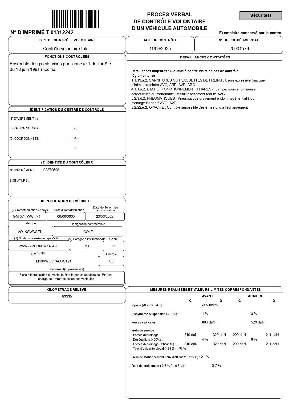 VASP (DERIV VP) VOLKSWAGEN GOLF 8 - 2.0 TDI SCR 116. Registered GM-074-WW, this car has 83335 kms on the clock. Put into service on 23 March 2023, it runs on diesel (GO), has a manual gearbox, 6 bhp tax rating - 2 seats. The vehicle is delivered with a single key. It is sold as is, without warranty, in accordance with the observations of the technical inspection carried out on 11/09/2025 - The bodywork has a few visible scratches - The vehicle is sold with an identification sheet. VOLUNTARY RATE of 18% inc. VAT (+ fixed fee of €40 excl. VAT per vehicle added if purchased via the Live Interencheres platform). VAT IS RECOVERABLE, and the cost of the technical inspection is €45.83 excluding VAT (i.e. €55 including VAT). The vehicle has been exhibited beforehand, allowing the buyer to view and examine it before the sale. Consequently, the purchaser acknowledges that he/she is acquiring the vehicle as is, with full knowledge of the facts, and without recourse or possible claim for breakdown, designation error or any other reason whatsoever. It is the purchaser's responsibility to carry out all the administrative formalities required for the change of ownership with the ANTS.