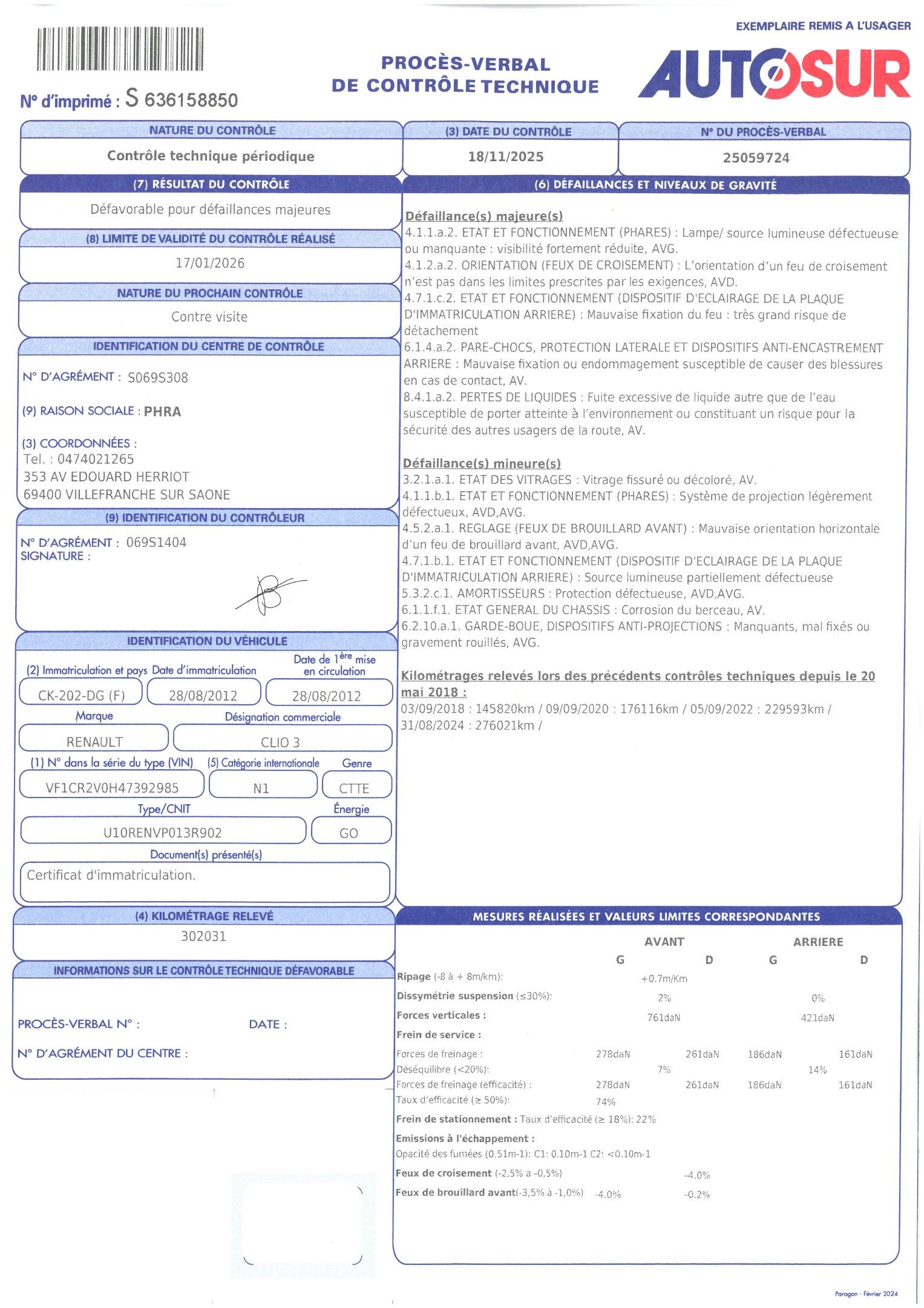 RENAULT CLIO 1.5 DCI - VISIT (by appointment with the study) ET ENLEVEMENT A VILLEFRANCHE - SUITE LIQUIDATION JUDICIAIRE -Genre : CTTE - Carrosserie : DERIV VP - Energie : GO - Couleur : BLANC - Kilometrage compteur : 302028 - 1ere M.E.C : 28/08/2012 - Power : 6 - VAT recoverable - Type mines : U10RENVP013R902 - Seats : 2 - Length : 399 - Width : 172 - Height : 150 - COUNTERVIEW