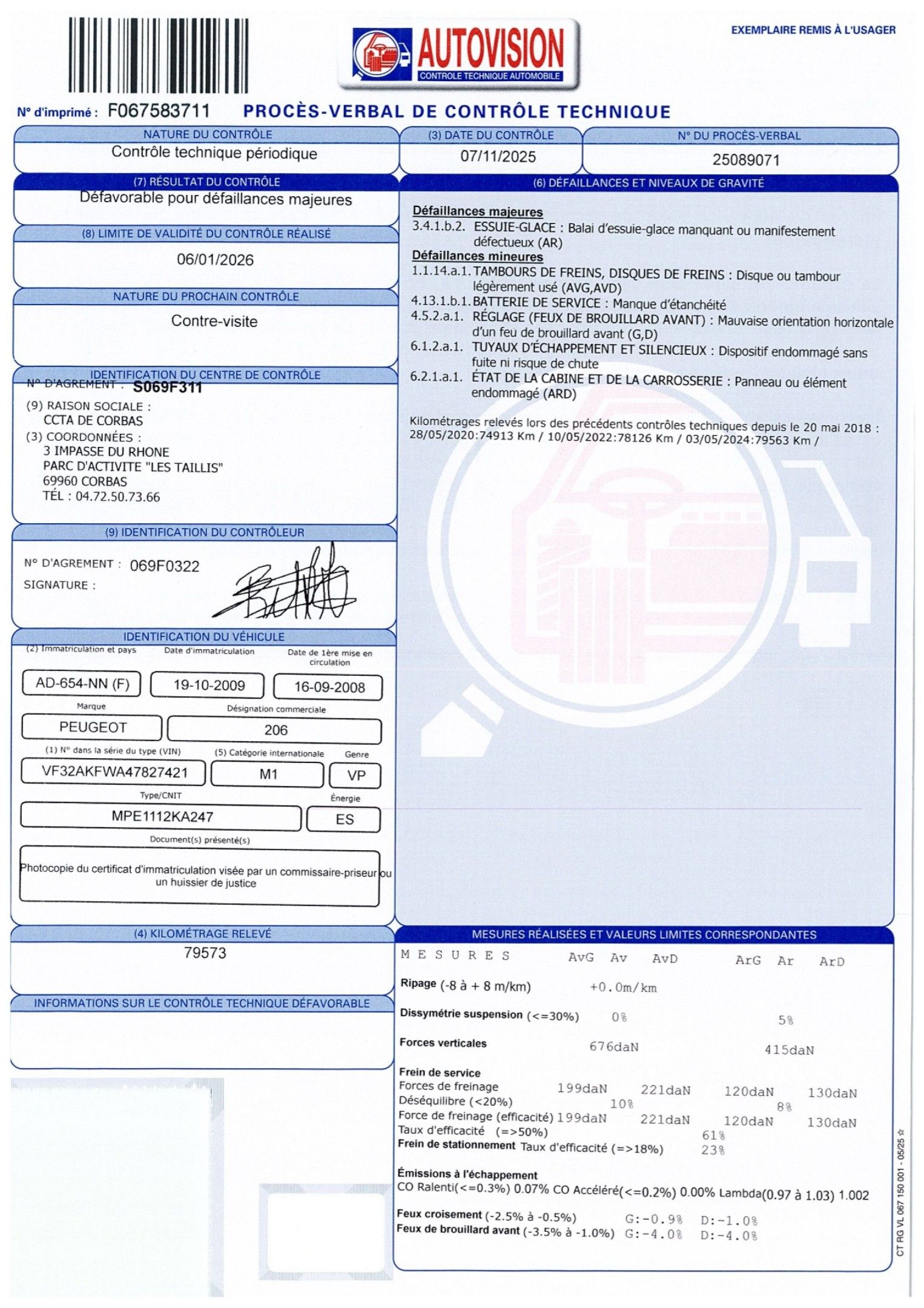 PEUGEOT * 206 - Type: PC - Body: CI - Energy: ES - Color: BLUE - Mileage: 79573 - 1ere M.E.C: 16/09/2008 - Power: 5 - Seats: 5 - Observations: CG - 1 KEY - WITHOUT PLEDGE OR OPPOSITION - BATTERY OUT - CHOCS CARROSSERIE - RAYURES