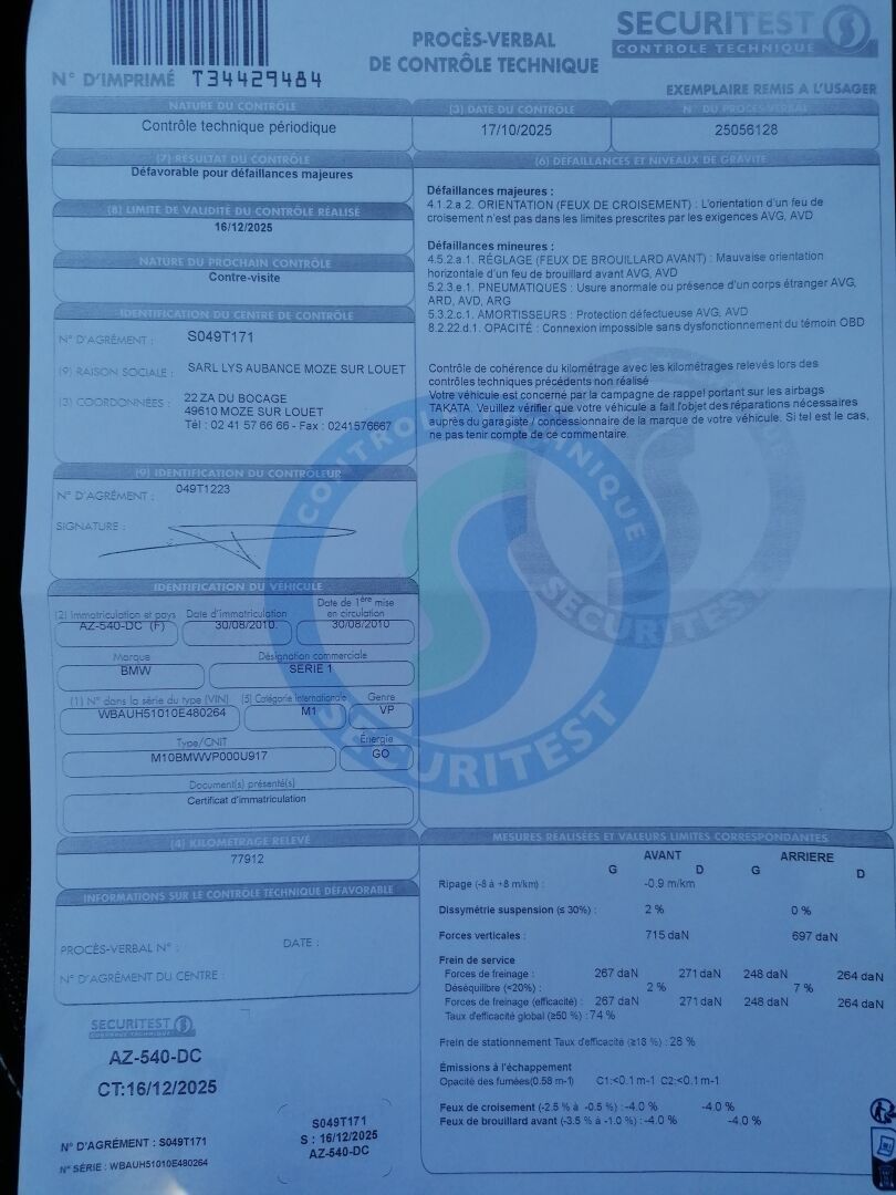 BMW SERIE 1 116 D 2.0 D 115 CV - Genre : VP - Body : BREAK - Energie : Go - Couleur : GRIS - Kilométrage compteur : 77912 - 1ere M.E.C : 30/08/2010 - Puissance : 6 - Type mines : M10BMWVP000U917 - Seats : 5 - Pack électrique-boite 6-radar de recul-Batterie HS - Equipements : CRUISE CONTROL / AIR CONDITIONING