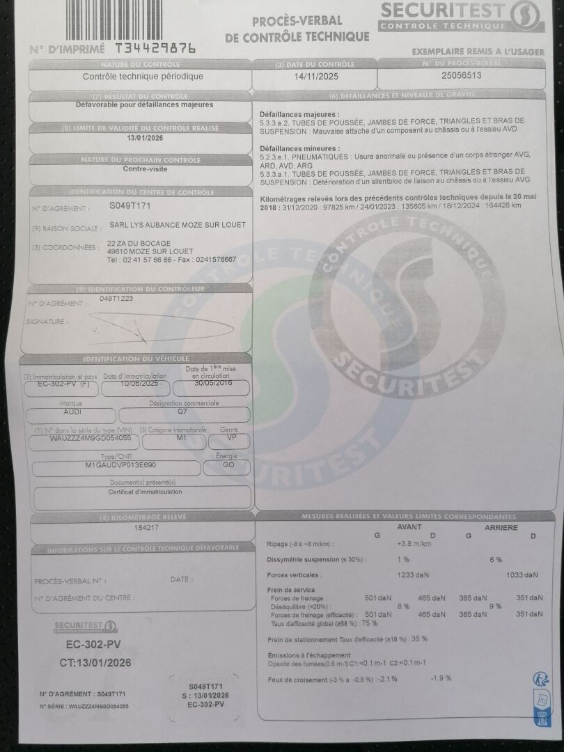 AUDI Q7 3.0 TDI V6 QUATTRO 218 CV - Genre : VP - Body : BREAK - Energie : Go - Couleur : NOIR - Kilometrage compteur : 184216 - 1ere M.E.C : 30/05/2016 - Puissance : 13 - Tva récupérable - Type mines : M1GAUDVP013E690 - Seats : 7 - Pack électrique-lim/reg de vitesse-boite automatique-radar/caméra de recul-radar av-1 clé - Equipements : CLIM / GPS