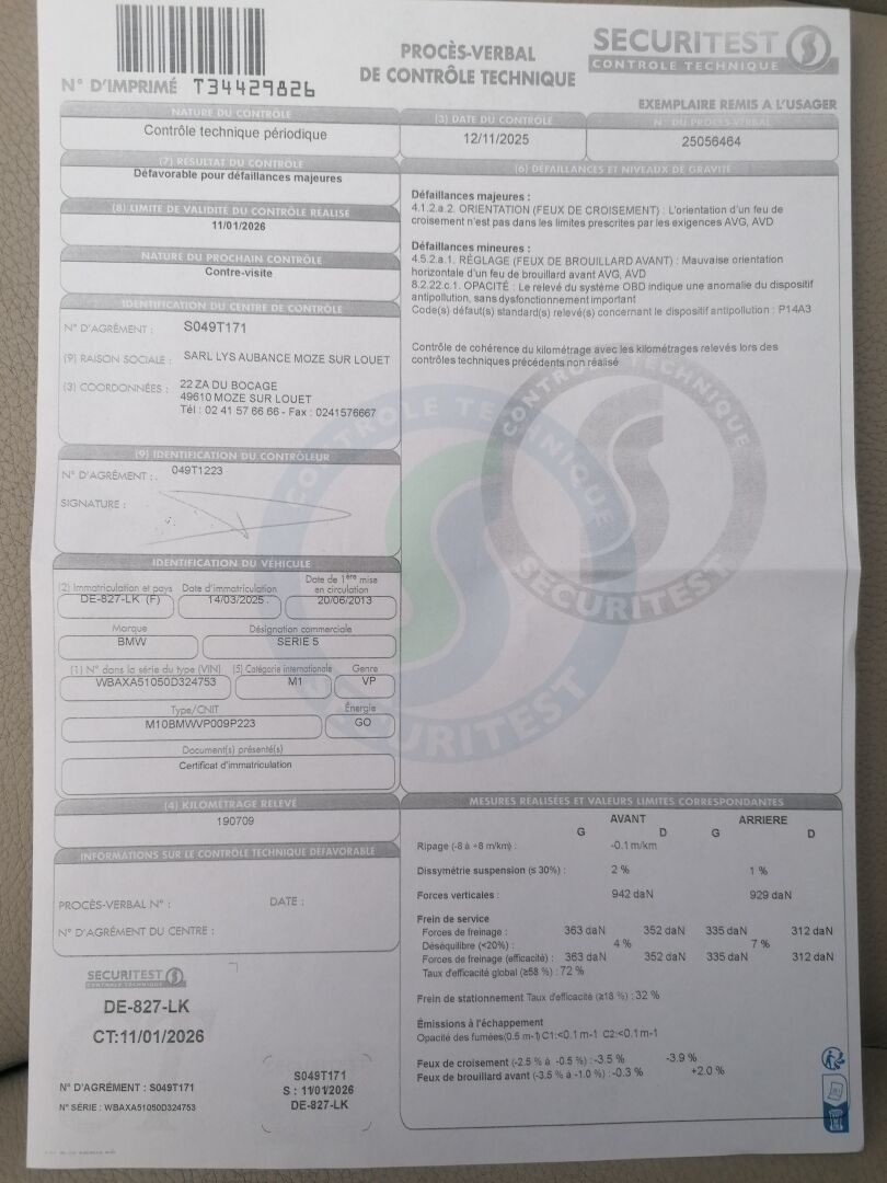 BMW SERIE 5 530 D 258 CV - Genre : VP - Carrosserie : CI - Energie : Go - Couleur : BLANC - Kilométrage compteur : 190710 - 1ere M.E.C : 20/06/2013 - Puissance : 15 - Tva récupérable - Type mines : M10BMWVP009P223 - Places : 5 - Pack électrique-lim/reg de vitesse-boite automatique-radar/caméra de recul-1 clé - Equipements : CLIM / GPS