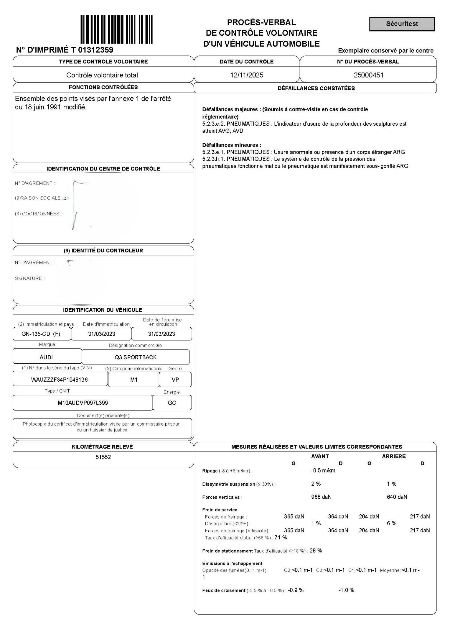 AUDI Q3 Série 2 (F3N) Sportback 35 2.0 TDI 16V S Tronic7 150 cv Boîte auto - Genre : VP - Body : CI - Energie : GO - Couleur : BLEU - Kilometrage compteur : 51548 - 1ere M.E.C : 31/03/2023 - Puissance : 8 - Type mines : M10AUDVP097L399 - Copy of registration document